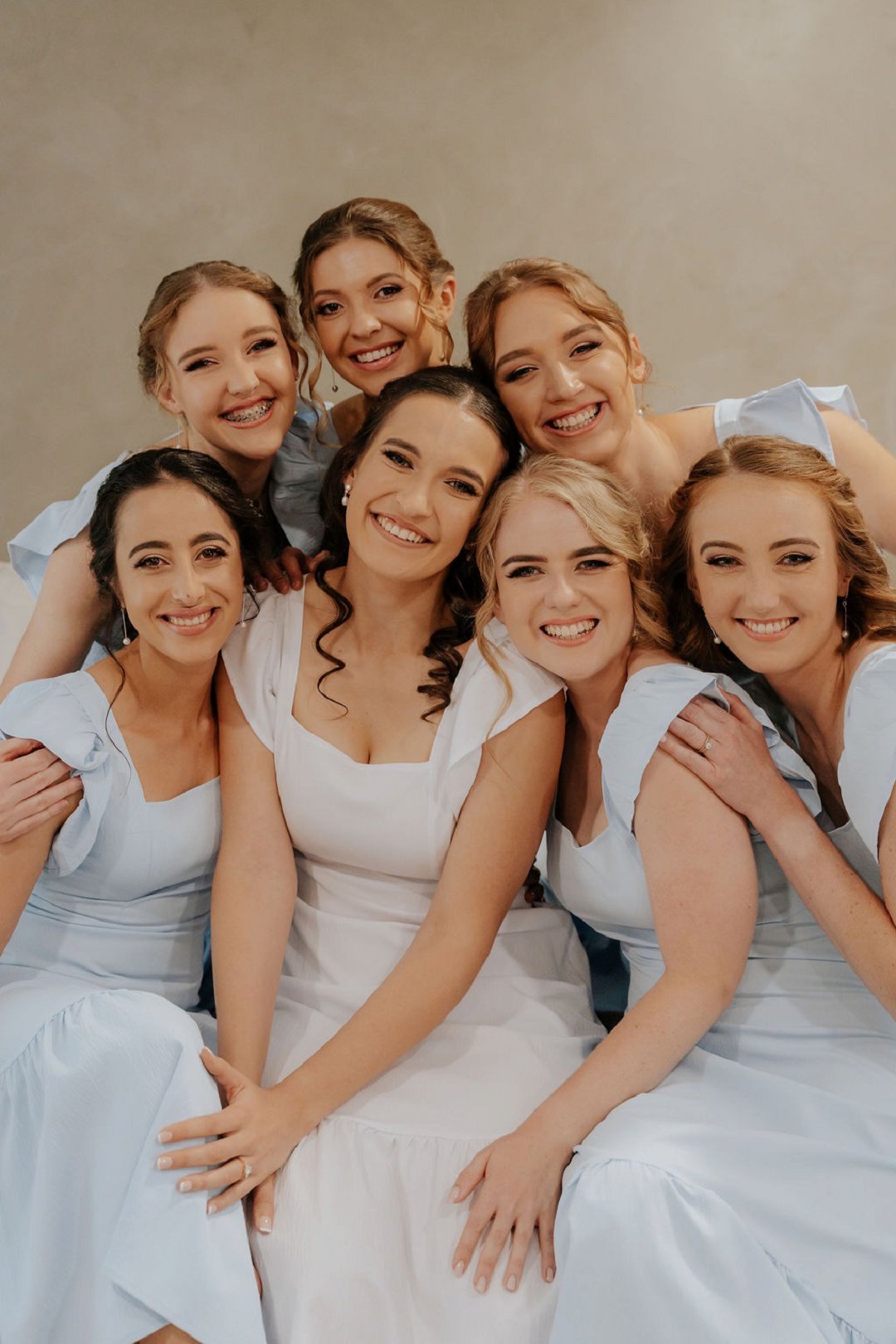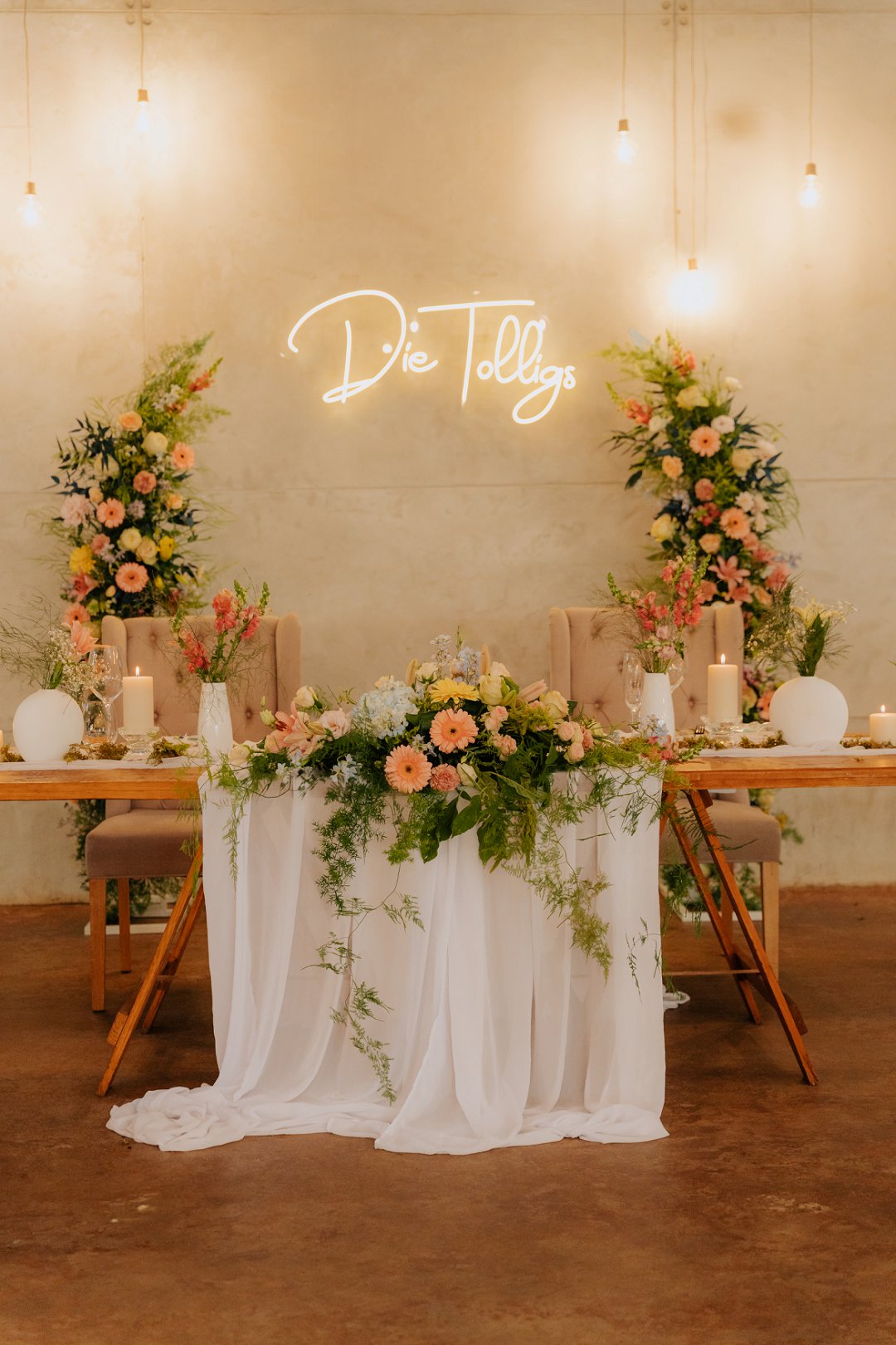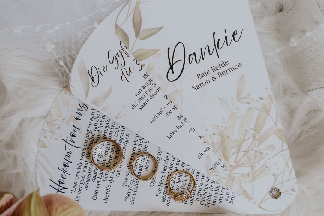 My man het ons trouwebwerf ontwerp en met prettige kwinkslae is uitnodigings en inligting gedeel. Ek wou kleur inbring met die dekor: helder pastelblomme wat gepas het by my bruidsmeisies se rokke in sagte skakerings. Ons het gaste aangemoedig om kleurvol aan te trek, wat die venue laat leef het. Ons trouprogram was handwaaiers — prakties én oulik vir ’n warm somersdag. ’n Fotomuur het ons storie deur die jare vertel, vol mense na aan ons hart. Een van my bruidsmeisies het ook ons verwelkomingsbord vol pragtige blomme geskilder.