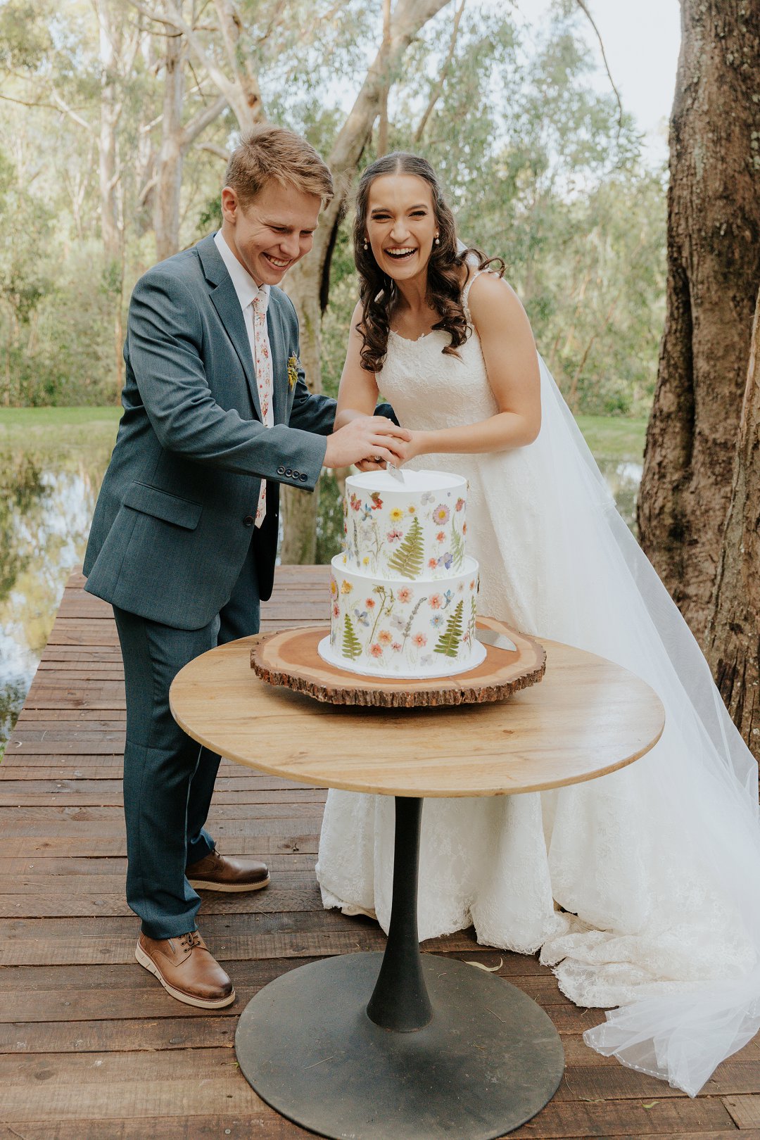 Ná baie rok-passings is my droomrok ontwerp en gemaak, terwyl Aaron sonder drama sy pak gekies het. Volgens hom is dit “nie so diep nie”. Ná ’n emosionele seremonie is ons as man en vrou verwelkom met canapé’s en speletjies op die gras. Ons het reeds daar aan ons pragtige troukoek begin eet en ’n slot aan ’n boom vasgemaak as simbool van ons verbintenis.