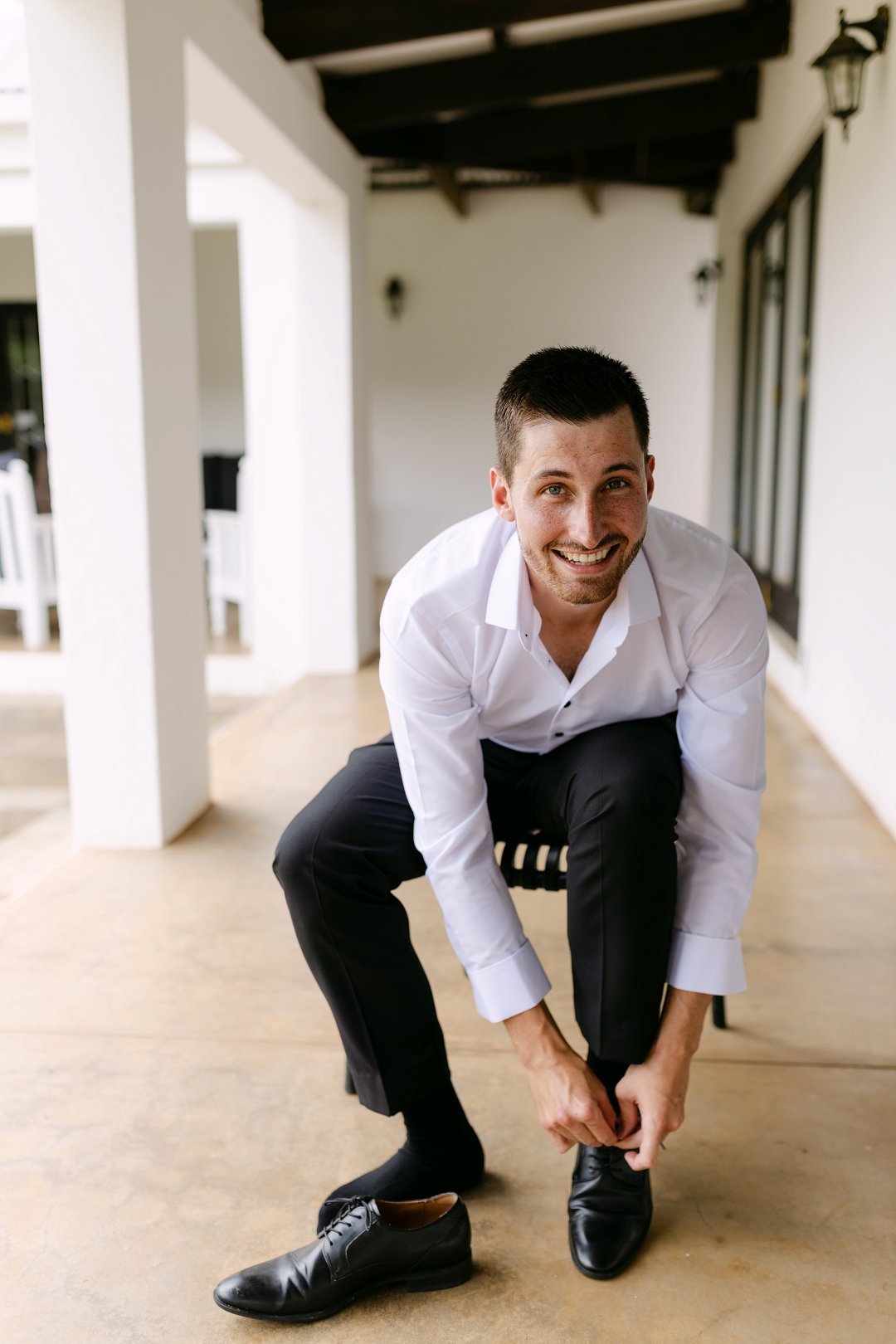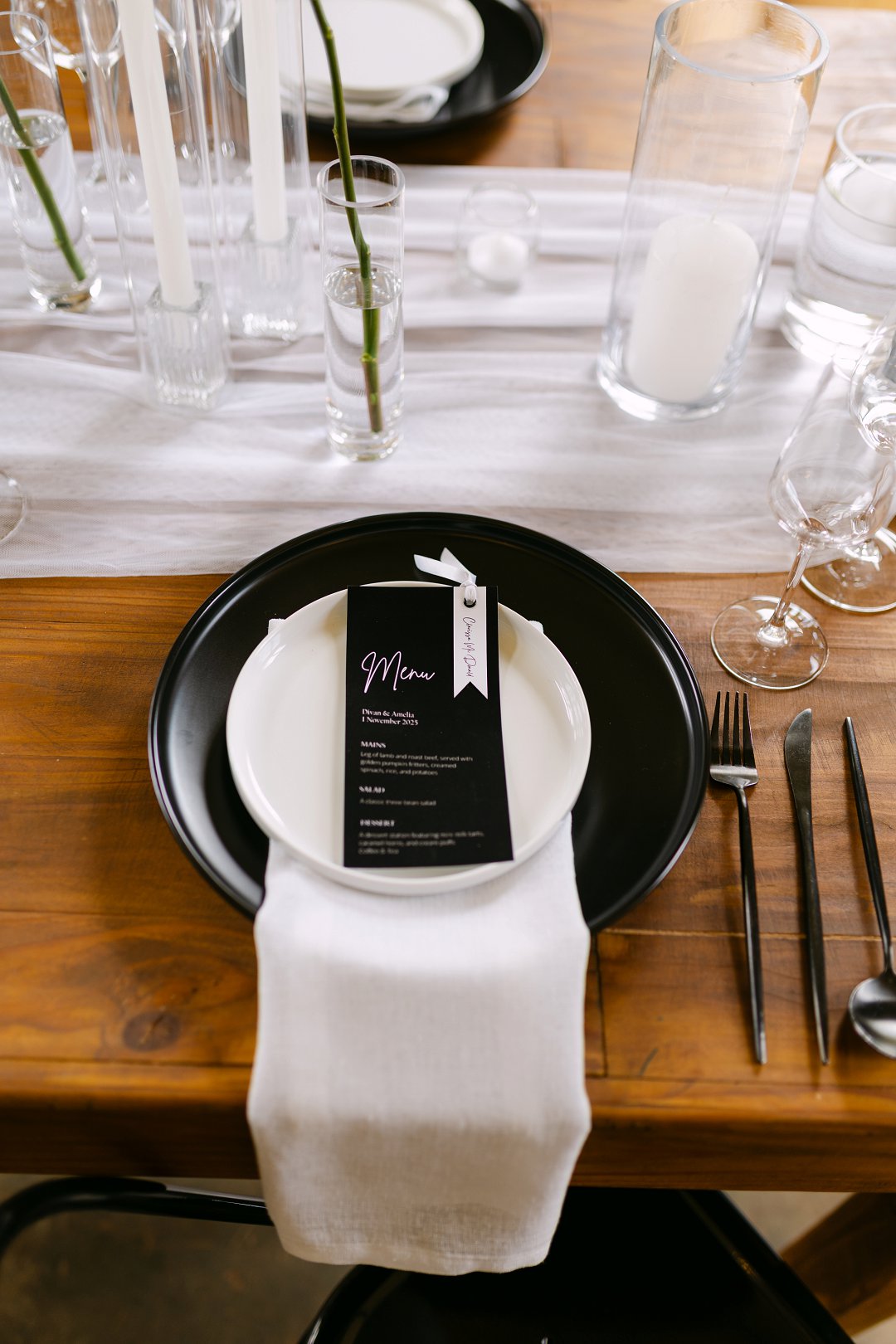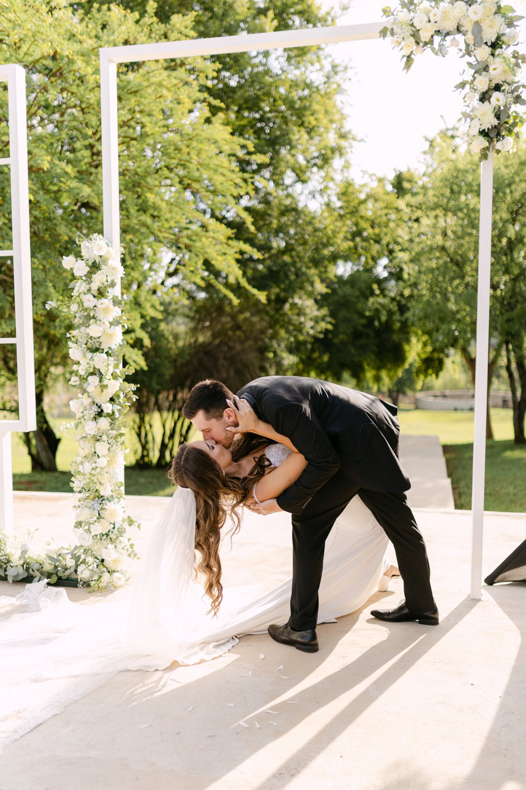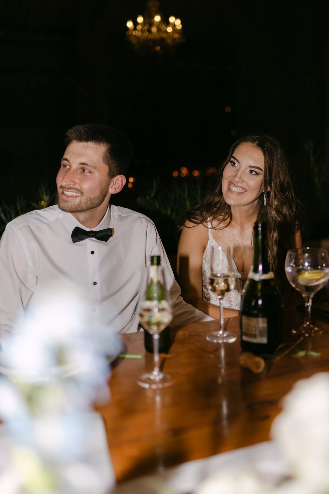 My trourok was ’n stywe spierwit rok met ’n oop rug, ʼn lang sleep met ’n bietjie kantdetail. Toe ek die rok die eerste keer aantrek het ek dadelik geweet dis die een. Divan het ’n elegante swart en wit pak gedra, wat saam met my rok die perfekte formele en elegante gevoel geskep het.