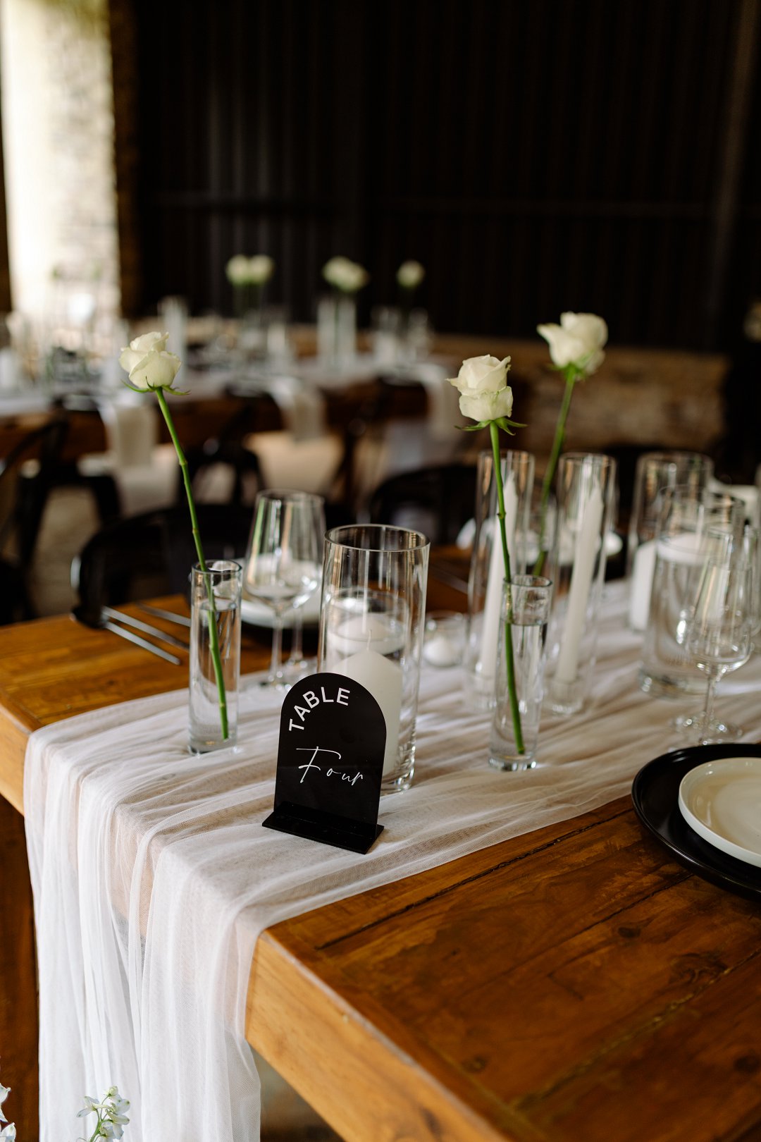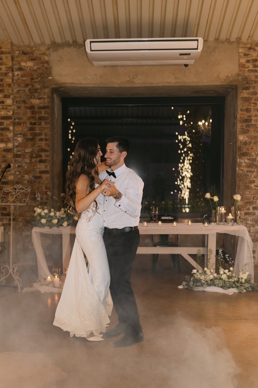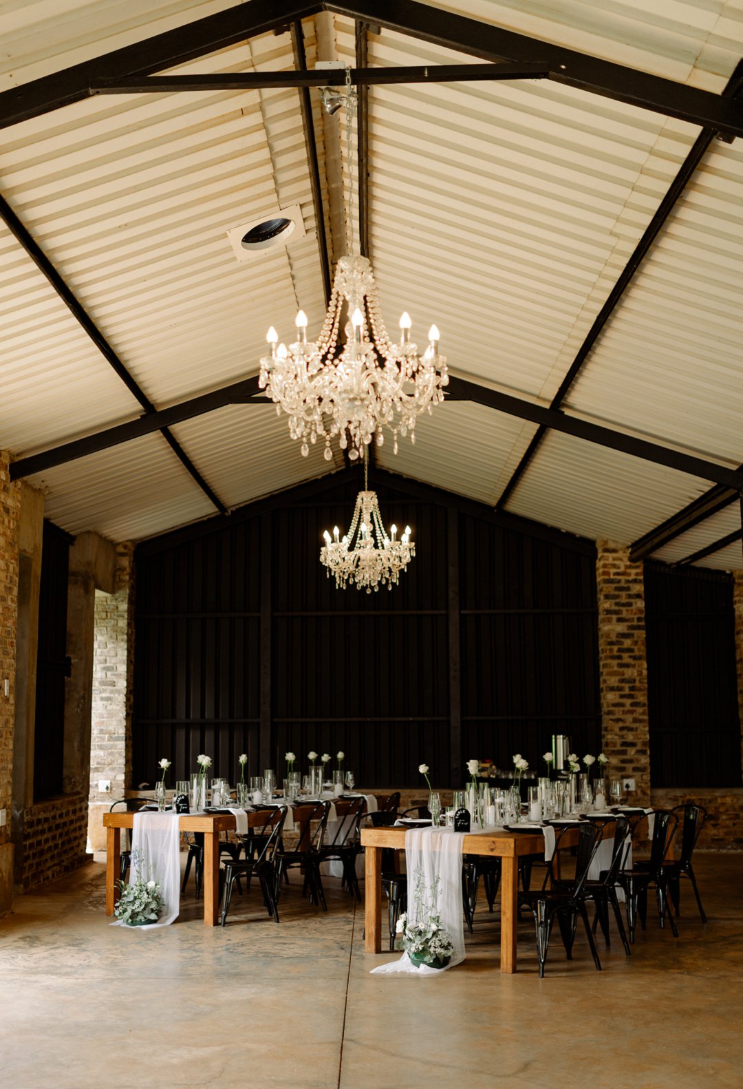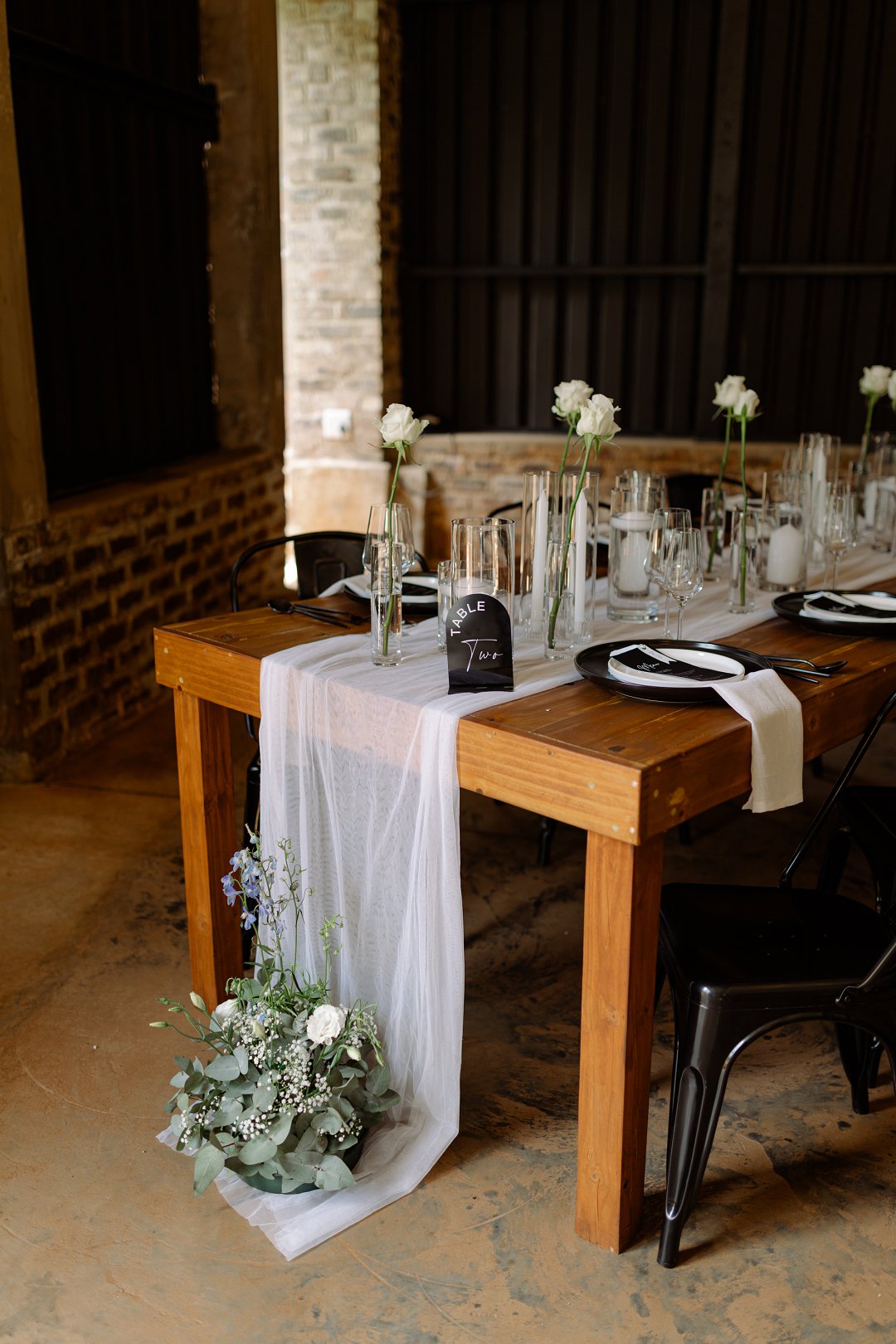 Ons venue was versier in wit en swart dekor met ligblou aksente. Ons blomme was hoofsaaklik wit rose met ’n paar blou blomme hier en daar. Saam het alles ’n elegante en tydlose gevoel geskep.