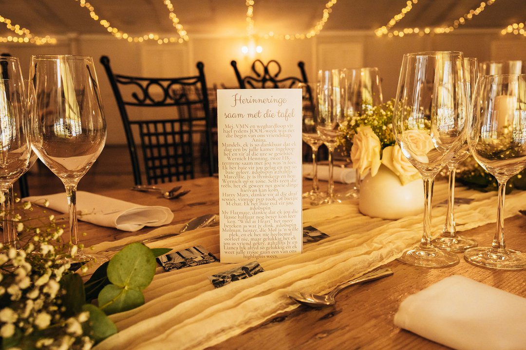 Ons troue was vol betekenisvolle detail – foto’s en herinneringe van geliefdes oral, wat elke tafel en elke oomblik met liefde gevul het.