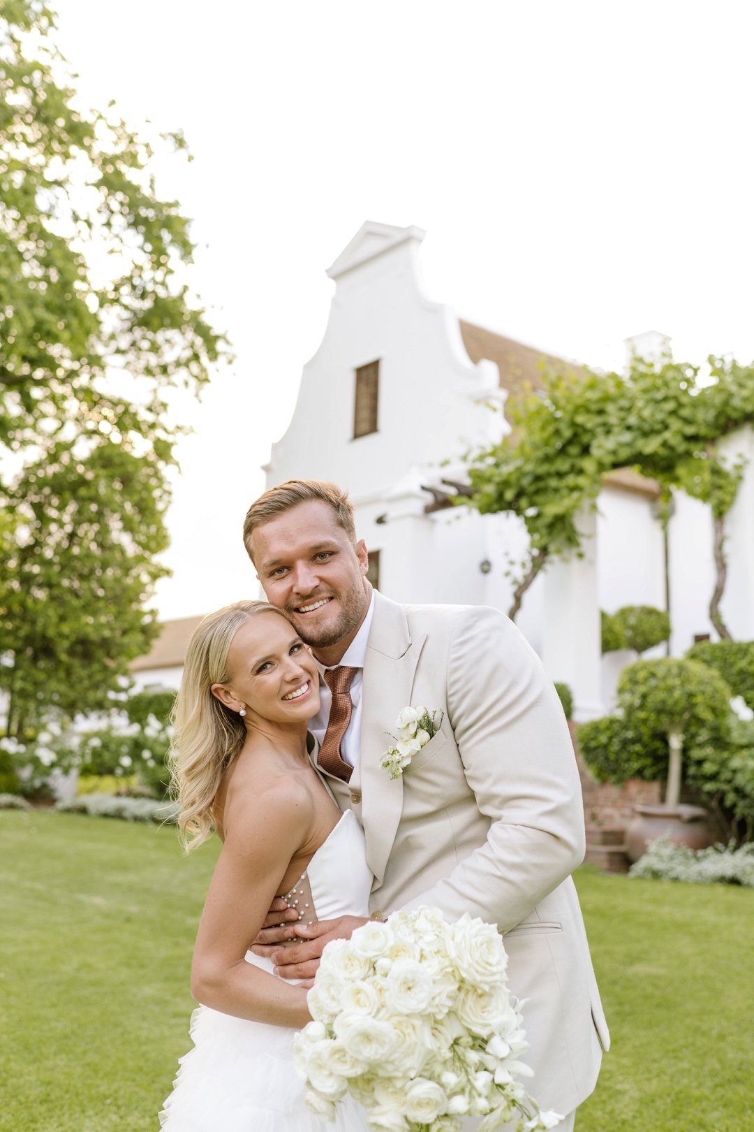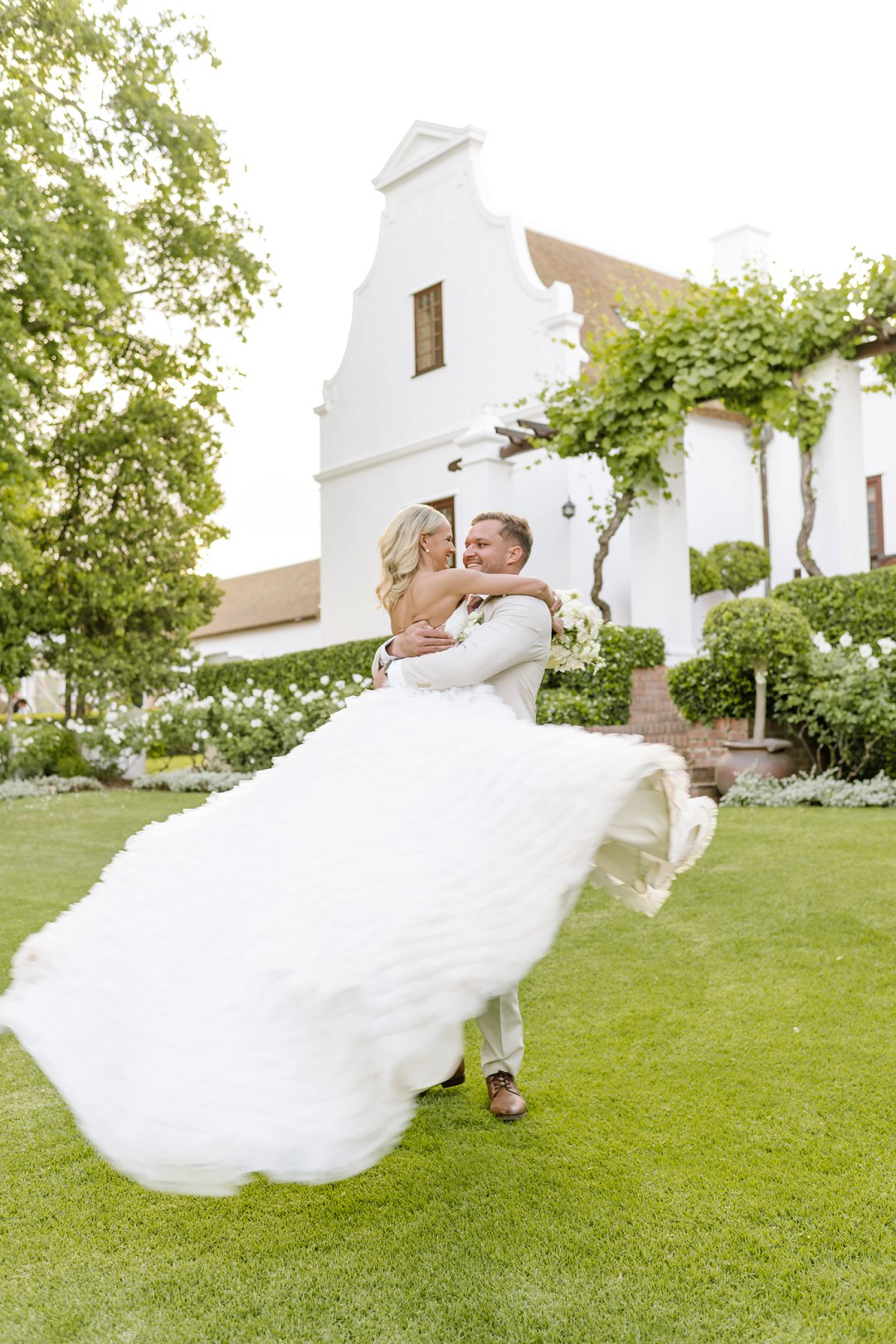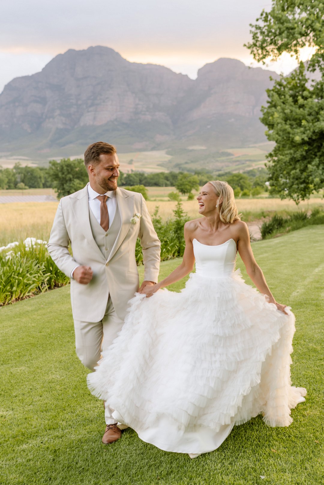 Ons het op 25 Oktober 2025 by Vrede en Lust in die Kaapse wynlande getrou – twee skoolliefdes wat mekaar steeds met dieselfde opgewondenheid en diepe liefde kies. Ons troudag was gevul met ’n rustigheid en vreugde wat ek nog nooit tevore ervaar het nie: liefde in oorvloed, dankbaarheid in elke oomblik en ’n gevoel dat alles presies is soos dit moet wees. Met wit blomme en sagte tikkies pampas het die dag ’n romantiese, sagte atmosfeer geskep, en my trourok se valle het pragtig daarby aangesluit en die hele gevoel van dromerige elegansie voltooi. Dit was nie net ’n troue nie, maar die begin van ons vir altyd – ’n dag wat vir altyd in my hart sal bly.