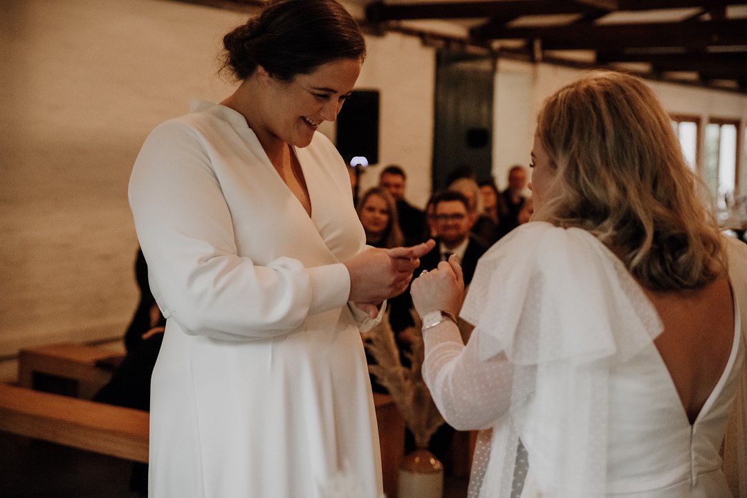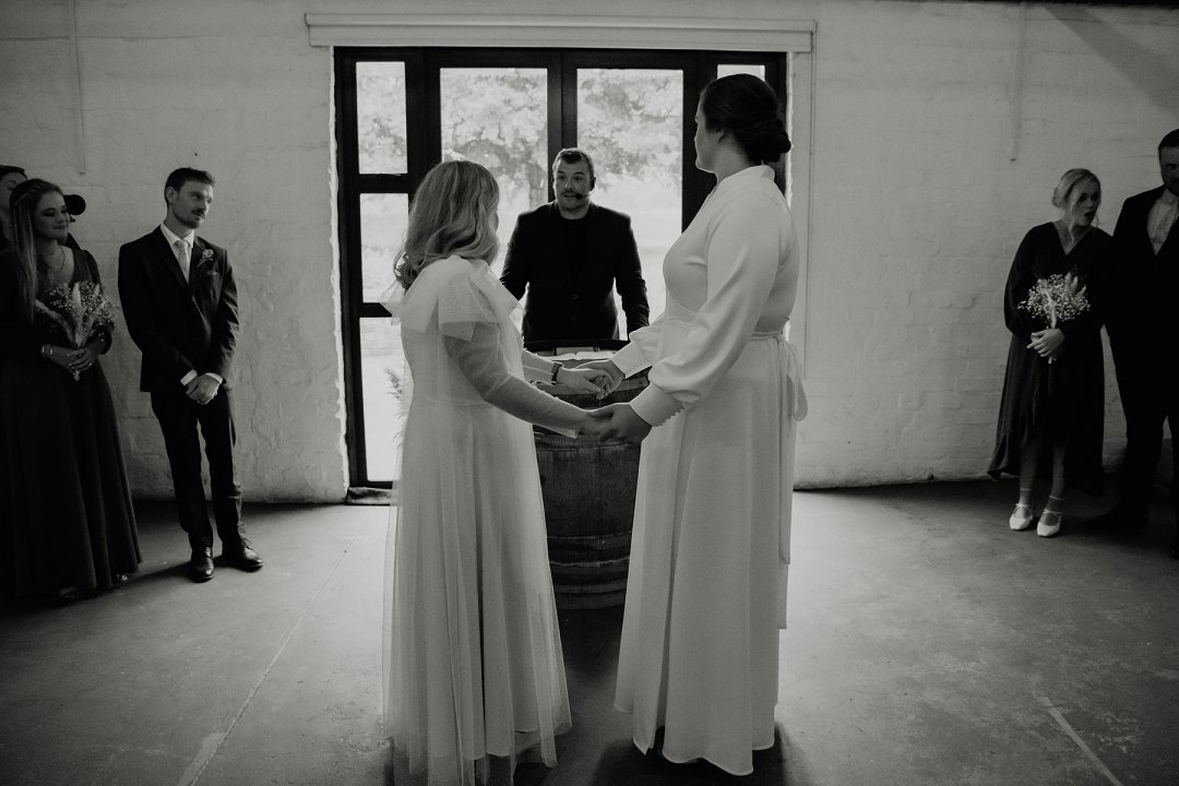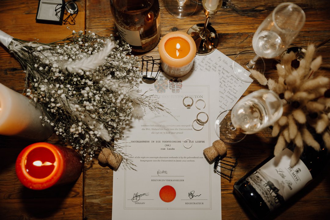 Trou is een van die belangrikste dinge wat jy in jou lewe kan doen. As jy dit doen, doen jy dit reg. Alles wat ek al ooit gelees of gesien het oor troubeplanning, was negtatief – enige iets kan verkeerd loop en dan voel dit of alles verkeerd loop, beplan, dink, skryf neer, dink weer, vee uit… Ons het besluit om dit nie te kompliseer nie. Dis nie so erg nie. Ons het klaar mekaar, toe moes ons dit net vier! Dis ‘n partytjie met lekker kos, goeie musiek en ‘n dêm mooi rok. Ons het net na een venue gaan kyk, daarvan gehou en dit gekies. Troubeplanning was vir my en Carmen die grootste seën. Dit het vir ons die lekkerste aktiwiteit geword om saam te doen na besige dae by die werk. Ons het ge-sjampanje en ge-spanwerk! Ons trourokke is by twee naaldwersters gemaak wat van hul huise af werk, wat al vir meer as een keer in ons lewens vir ons rokke gemaak het. Blomme was gedroog, want ek hou nogal van iets wat hou (soos die liefde), so ons het dit na die tyd uitgedeel en dit staan nou nog in ons familie en vriende se huise. Ons het gethrift waar ons kon en gemaak en geleer soos ons aan gegaan het. Ons het 60 gaste genooi en net twee kon dit nie maak nie, omdat hulle in die buiteland is. Ander het ingevlieg en ingery en die ongelooflikste planne gemaak om in ons dag te kon deel. Dit spreek boekdele oor die mense in ons lewe en hoe ons dag uitgedraai het – ‘intentional’ en bitterlik spesiaal. Ons het in die hartjie van die winter getrou, so natuurlik het dit die heeldag gereën – en dit was ongelooflik! Ek sal dit sommer elke jaar weer doen! My en Carmen se liefde is nie moeilik nie, ons lééf saam en hierdie gevoel was tasbaar en sal altyd tasbaar wees wanneer iemand in ons teenwoordigheid is.
