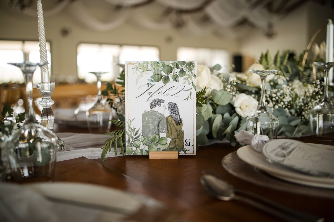 Die bruid se rok was alles waarvan sy gedroom het – tydloos, elegant en met fyn detail wat haar persoonlikheid perfek vasgevang het. Die bruidegom se pak het sy styl en selfvertroue weerspieël en het pragtig by die tema en dekor ingepas.