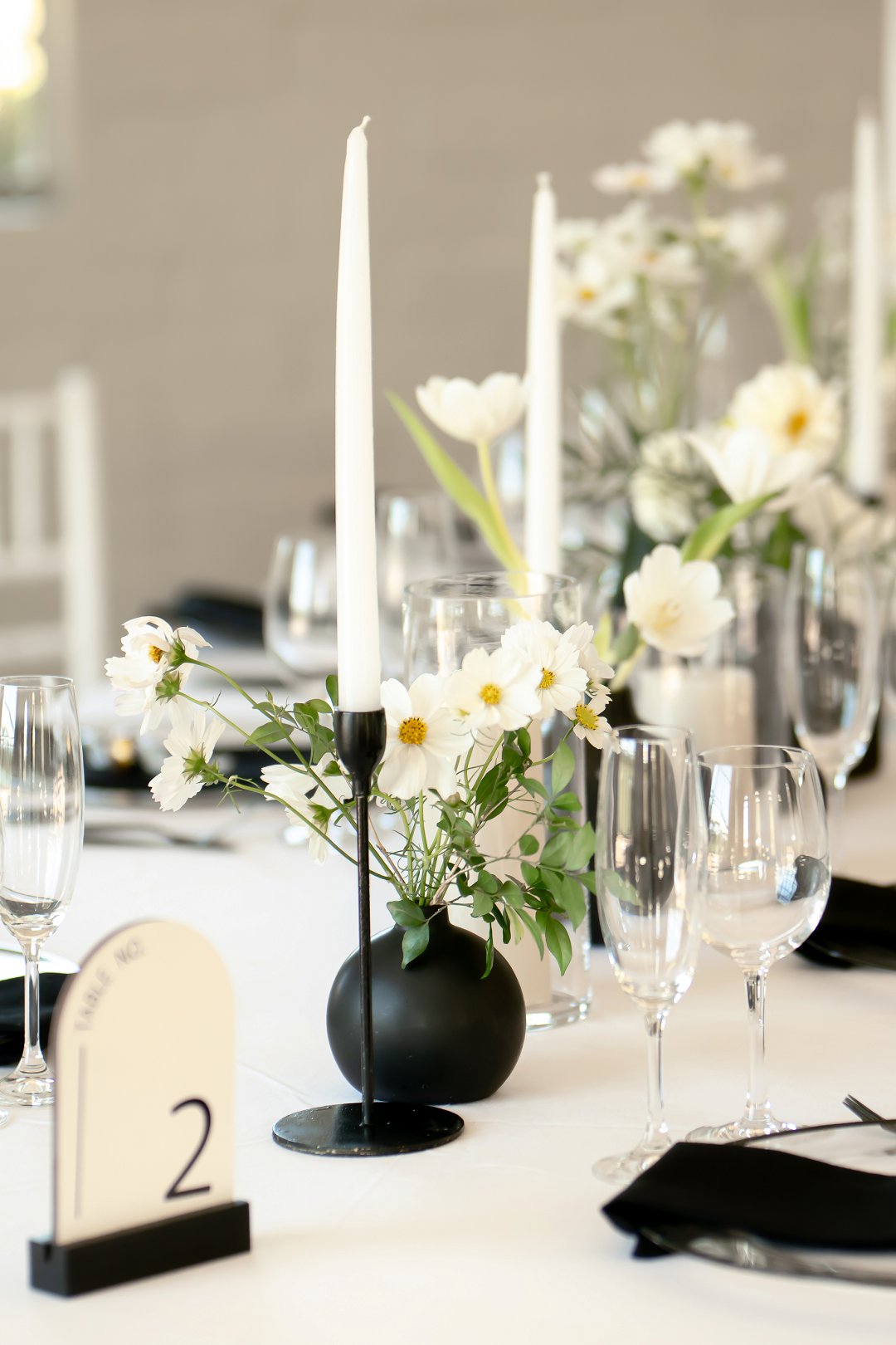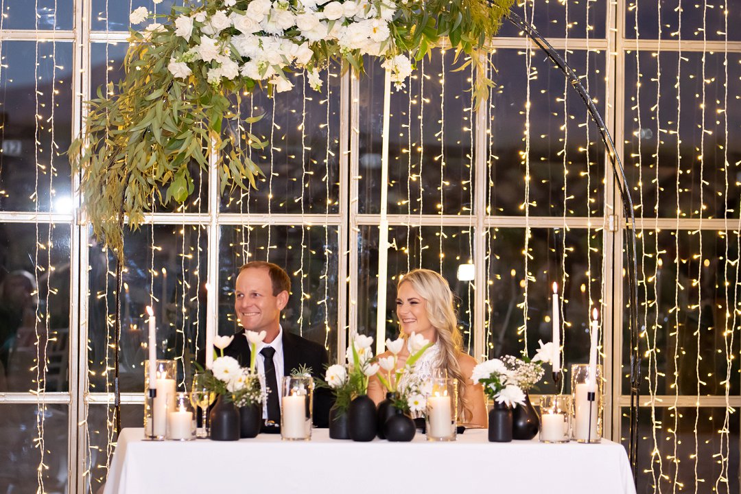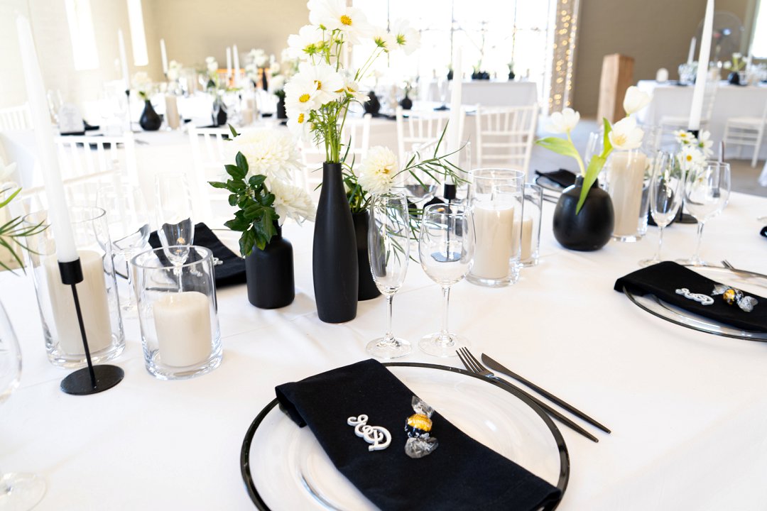 Ons dekor was elegant, stylvol en minimalisties. Alles wat wit en swart, net genoeg blomme, kerse en liggies. Almal het ook swart aangetrek en dit was soos hul sê ‘less is so much more’!