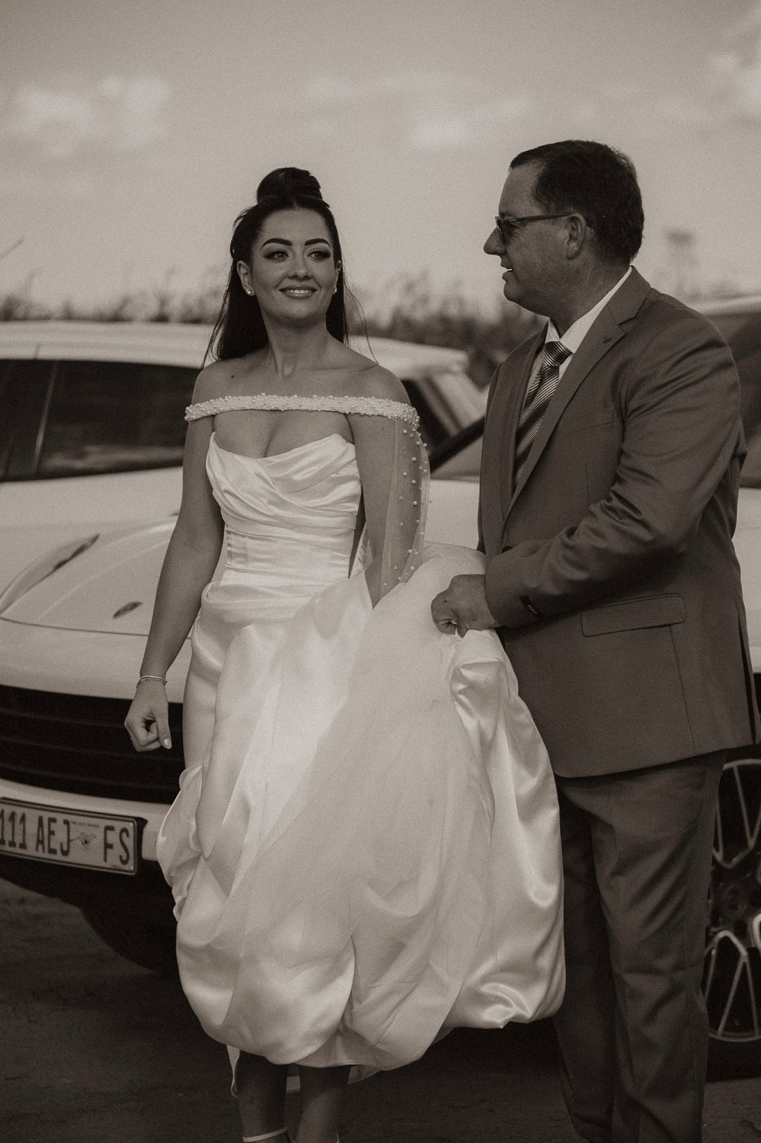 Terselfdertyd was ons besig om ons huis op die dorp in te rig. Een van die dinge wat ek graag wou klaarkry, was die plaveisel voor die motorhuis. My pa het die plaveisel vir ons bestel, maar drie dae nadat dit afgelewer is, het ek gesien dit lê nog net daar. Ek kon dit nie verstaan nie, maar ek het niks gesê nie, want ek het geweet almal is besig op die plaas met die voorbereidings vir die troue.Eers later het ek agtergekom dat my pa die plaveisel vir die troue geleen het. Hy het dit tussen die mielies begin pak sodat die vroue nie met hul formele rokke in die stof hoef te loop nie. Dit het my diep geraak. Daardie eenvoudige, liefdevolle gebaar het presies gewys wie my pa is en hoe almal om ons gewerk het om hierdie dag volmaak te maak.My rok was alles waarvan ek ooit kon droom. Jolanche Couture het dit vir my gemaak en sy is eenvoudig fantasties. Sy het my droom laat waar word. Elke fyn steek, elke vou en elke detail het gevoel soos iets uit ’n sprokie. My man se Polo pak het perfek by die styl van die dag gepas. Tussen die mielies, met die sagte wind wat deur die blare fluister, het ons die Here se teenwoordigheid gevoel. Alles het so stil, heilig en vol liefde gevoel. Wat ek en Herman het is anders en ons troue getuig daarvan.
