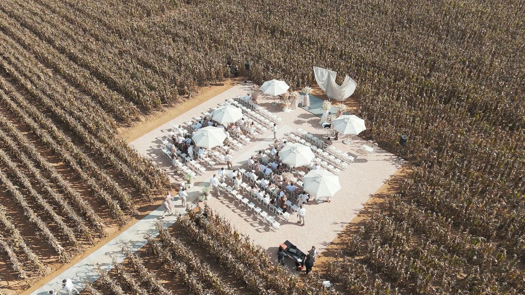 Daar was egter ’n klein uitdaging. Die plan was dat die mielies gestroop sou word om plek te maak vir die seremonie, maar weens die nat weer was dit nie moontlik nie. Die mielies was eenvoudig nog nie gereed nie, en ’n gedeelte moes uitgekap word om ruimte te maak. Ek onthou hoe almal saamgespan het om dit moontlik te maak. Familie, vriende en werkers het hande gevat om ons droom te bou.