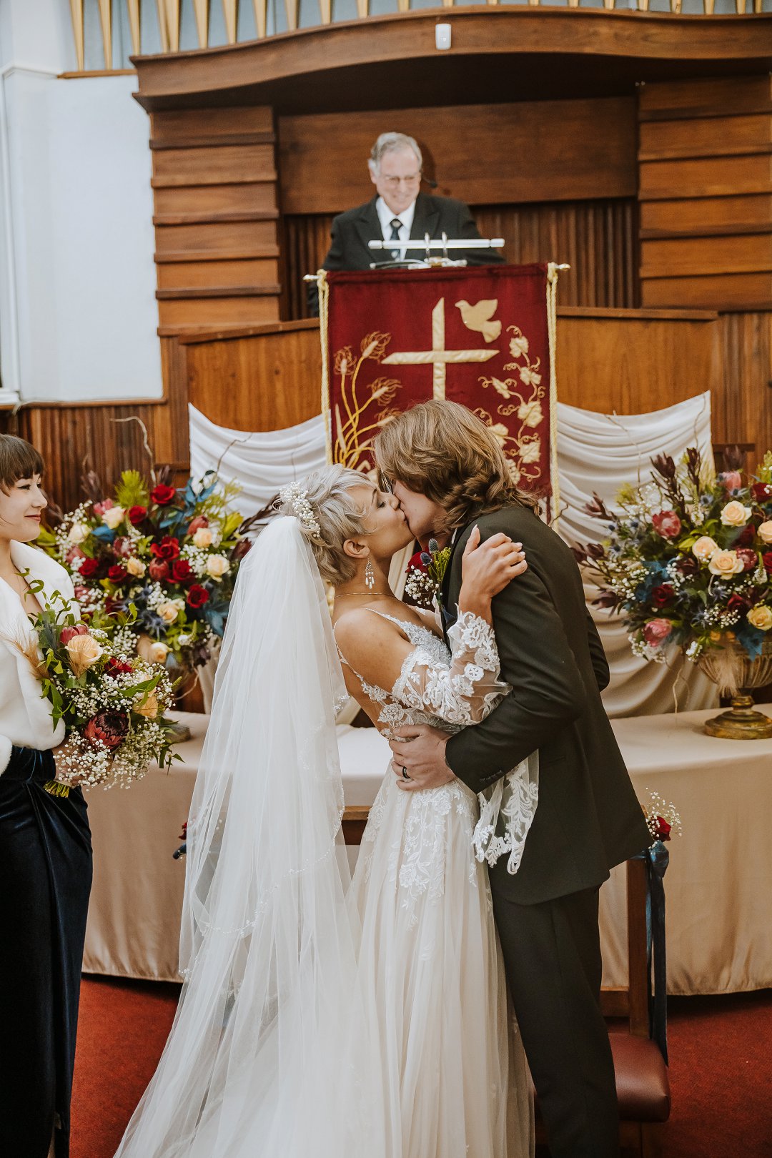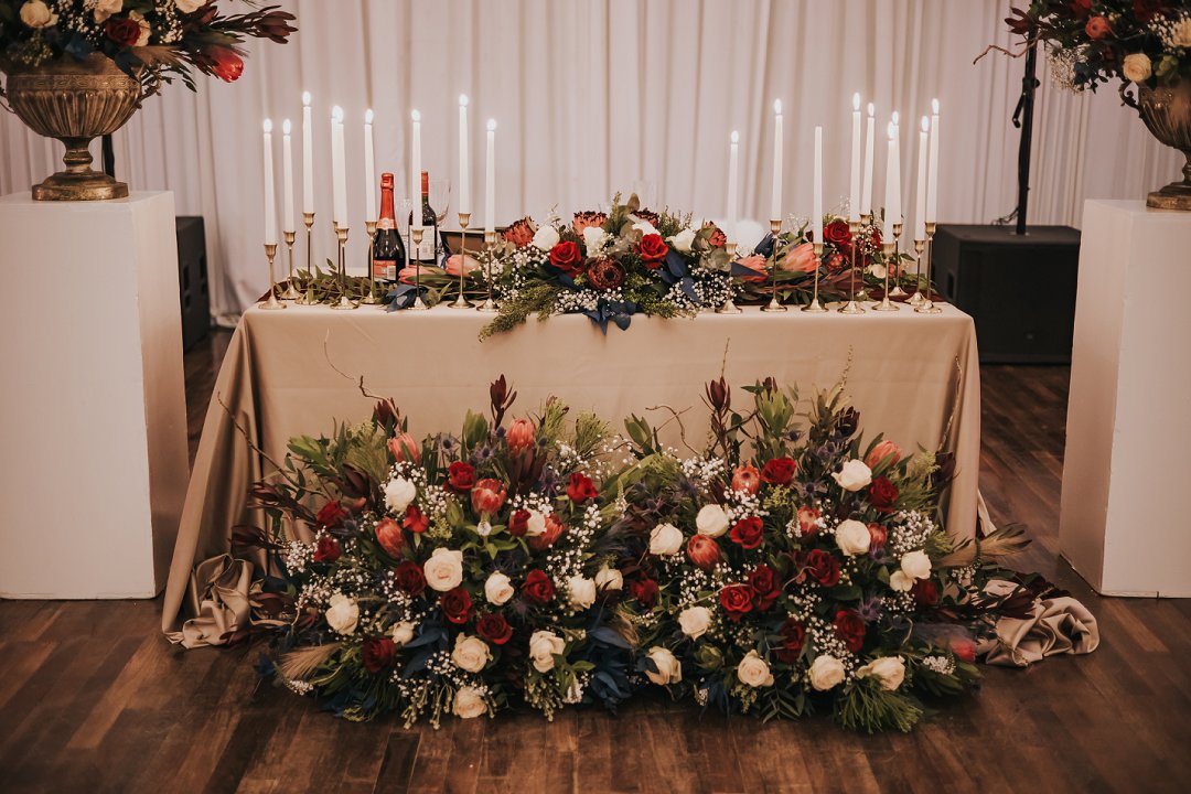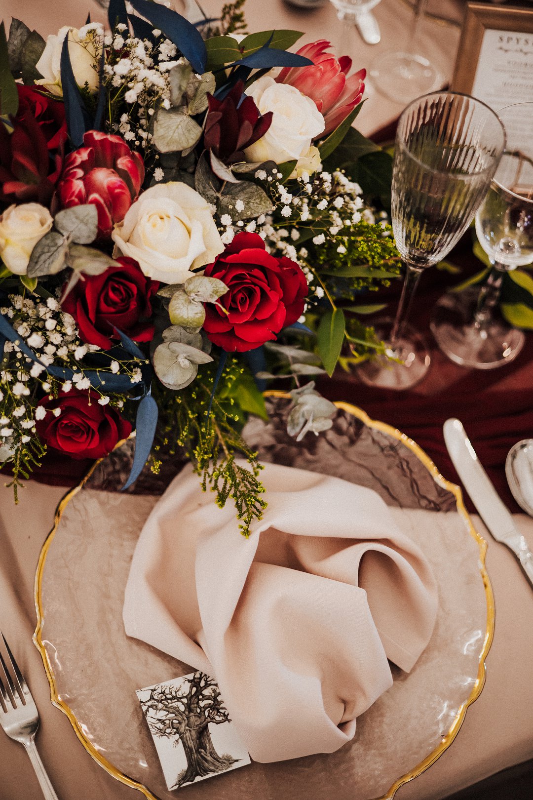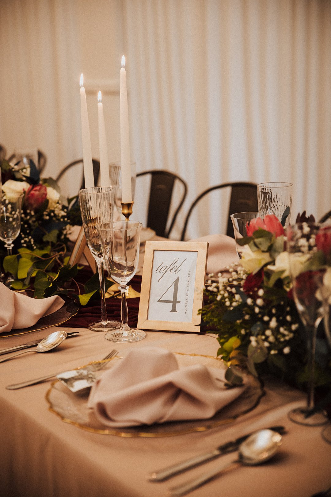 Ons troue was waarlik ‘n spesiale ervaring wat ons uniekheid en liefde as ‘n paartjie ten toon gestel het. Ons het in die hartjie van winter in die Stad van Rose ons beloftes aan mekaar afgelê by NG Gemeente Noordhoek, die einste kerk waar die bruid se ouers vyf-en-twintig jaar tevore ook die register geteken het. Vir die paartjie wat beide in die kunste betrokke is, was klassieke estetika en tradisie met gemak baie belangrik. Die troue was ‘n geleentheid waar familie en vriende saamgespan het om die dekor en gepaste atmosfeer te skep. Die blomme is deur ‘tannie Annetjie’ gerangskik. Haar blomme het nog altyd gepruik voor in die kerk en was beeldskoon gekroon met ons nasionale blom. Die skakerings van rooi, sagte pienk en vlootblou is verder vir die onthaal bymekaar gesit deur die bruid se ma, twee sussies en ‘n geliefde familie vriendin.