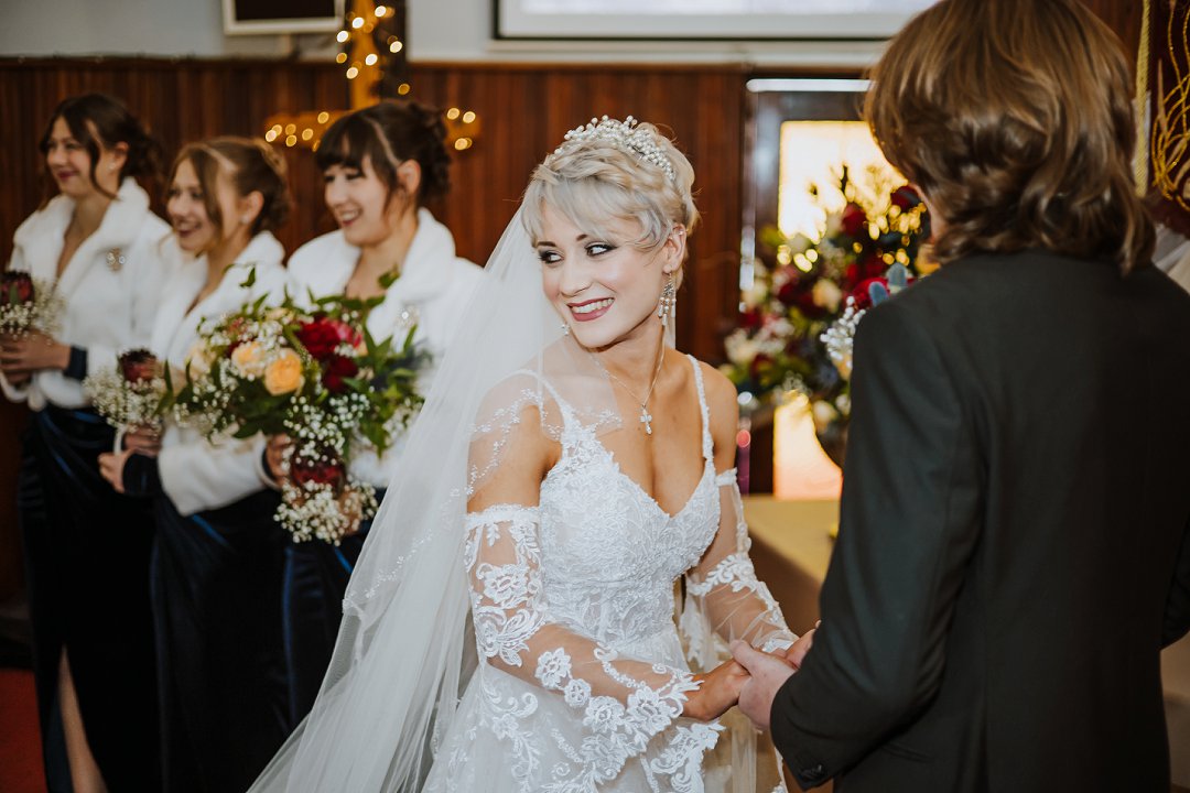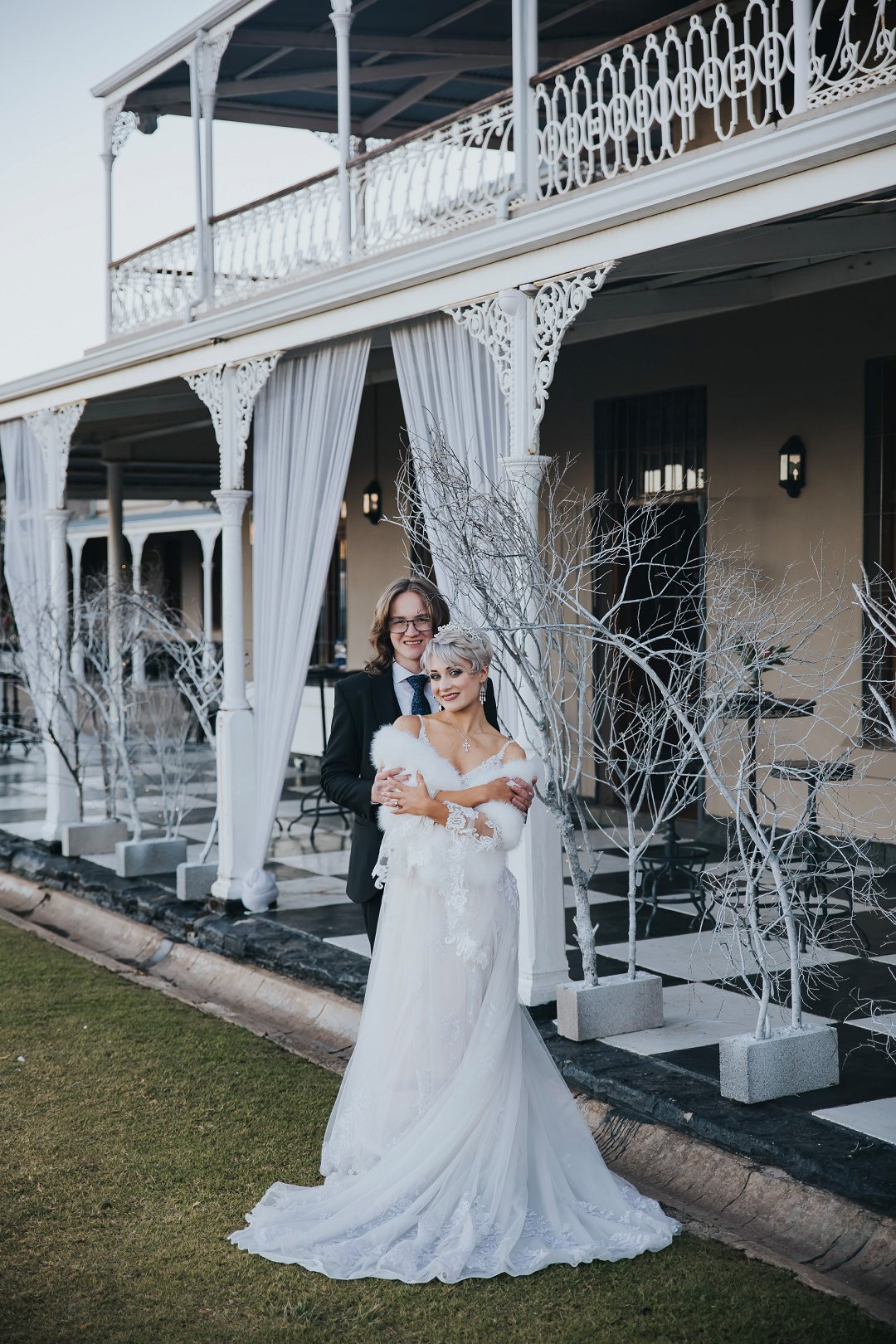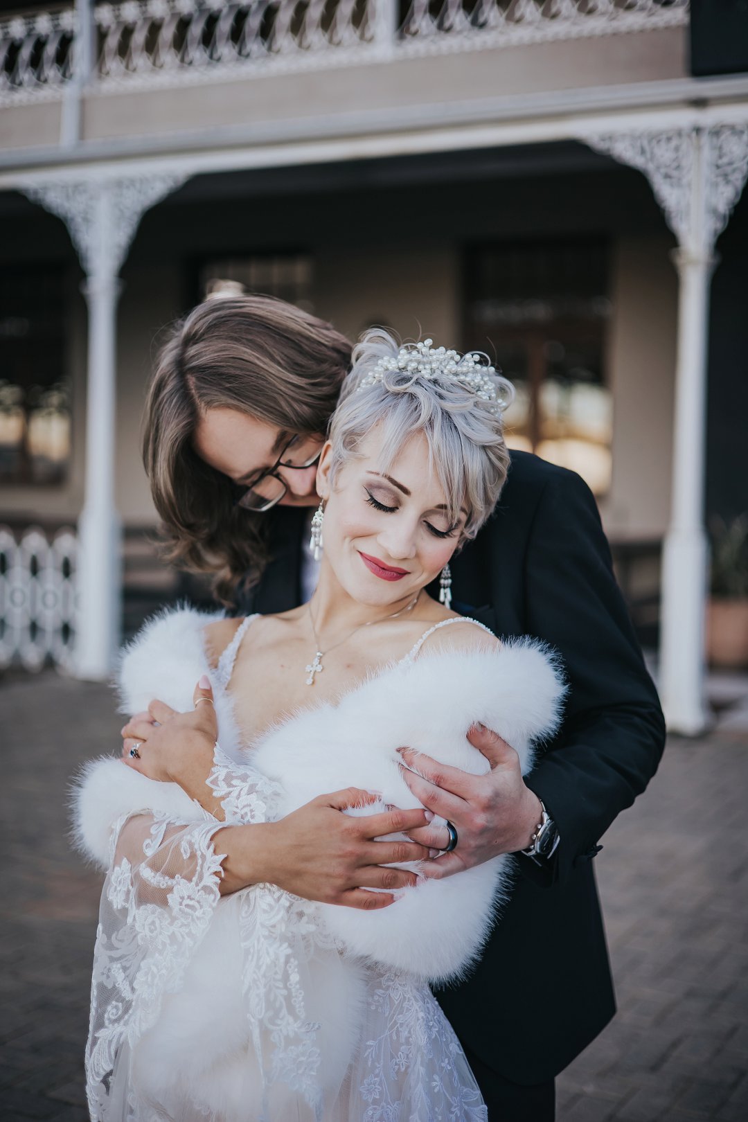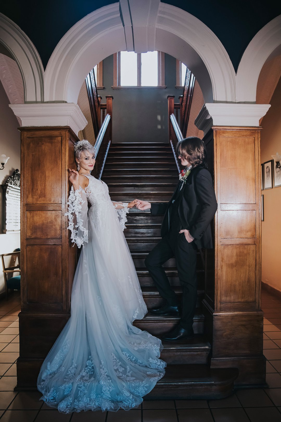 Daar was eers ‘n paar weergawes van die ‘droom trourok’ voordat die bruid op die snit by Bridal Emporium afgekom het. Ingevoer van Australië, met ‘n heuning-kleurige ondertoon, het die fyn gedetailleerde A-lyn sleë haar hart gesteel. Die sluier is sentimenteel en geleen van haar tannie af by wie se troue sy ‘n blomme meisie was. Afgerond met die ‘ietsie-blou’ was haar verloofring en haar vier strooi meisies wat gespog het in blou fluweel. Die bruidegom het ‘n tradisionele aandpak gedra met satyn detail. Die das was sy keuse van blou ‘paisley’ en sy hare in lang krullerige lokke gedra.