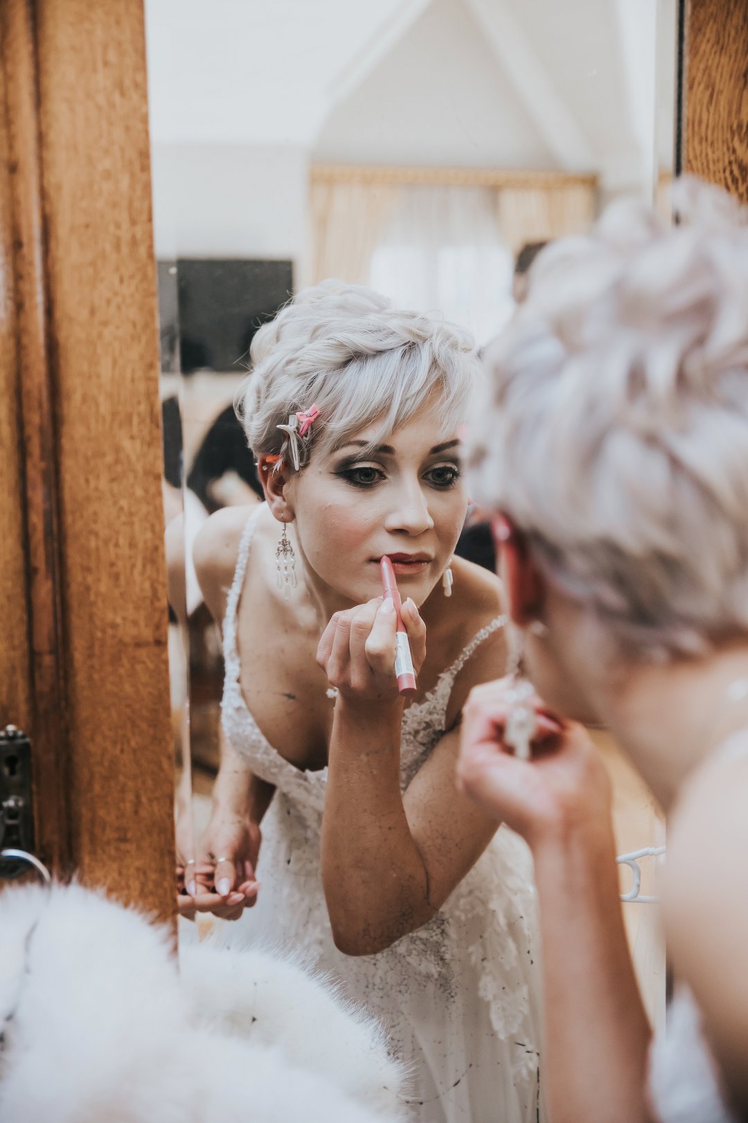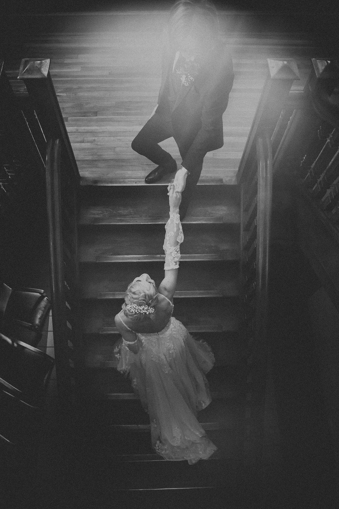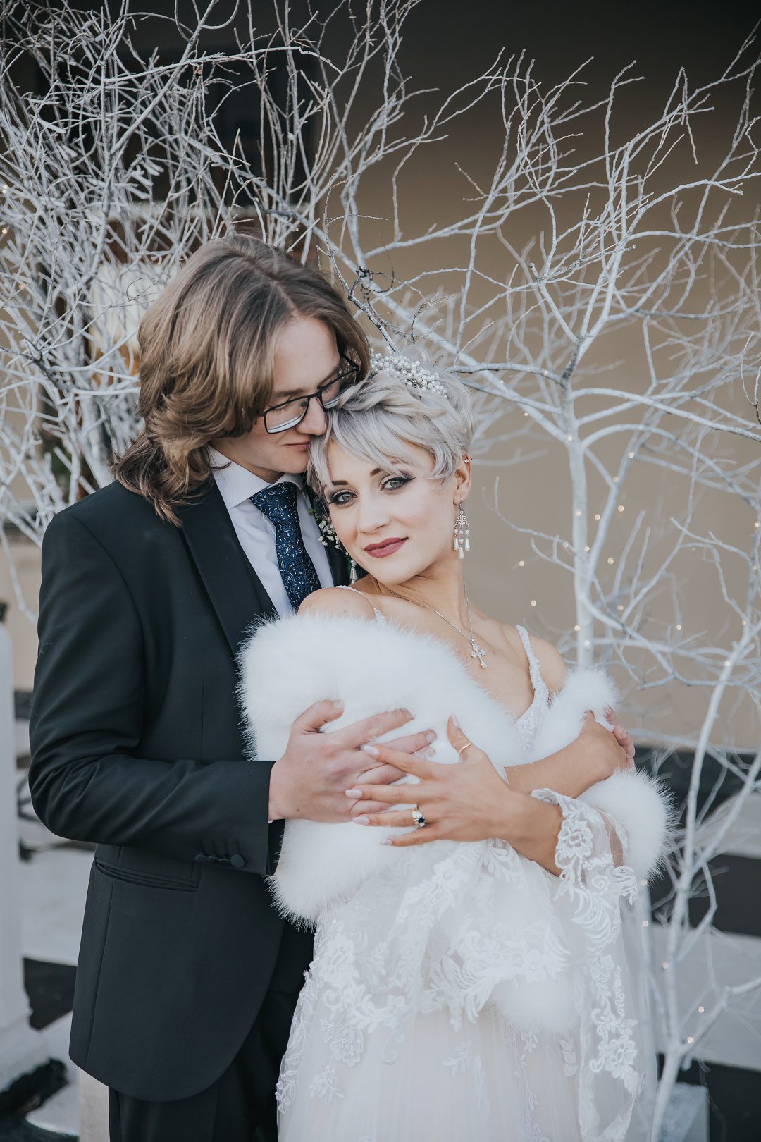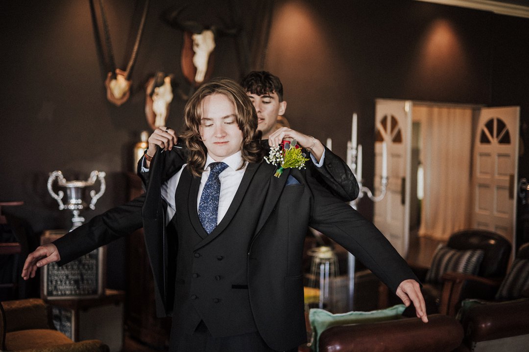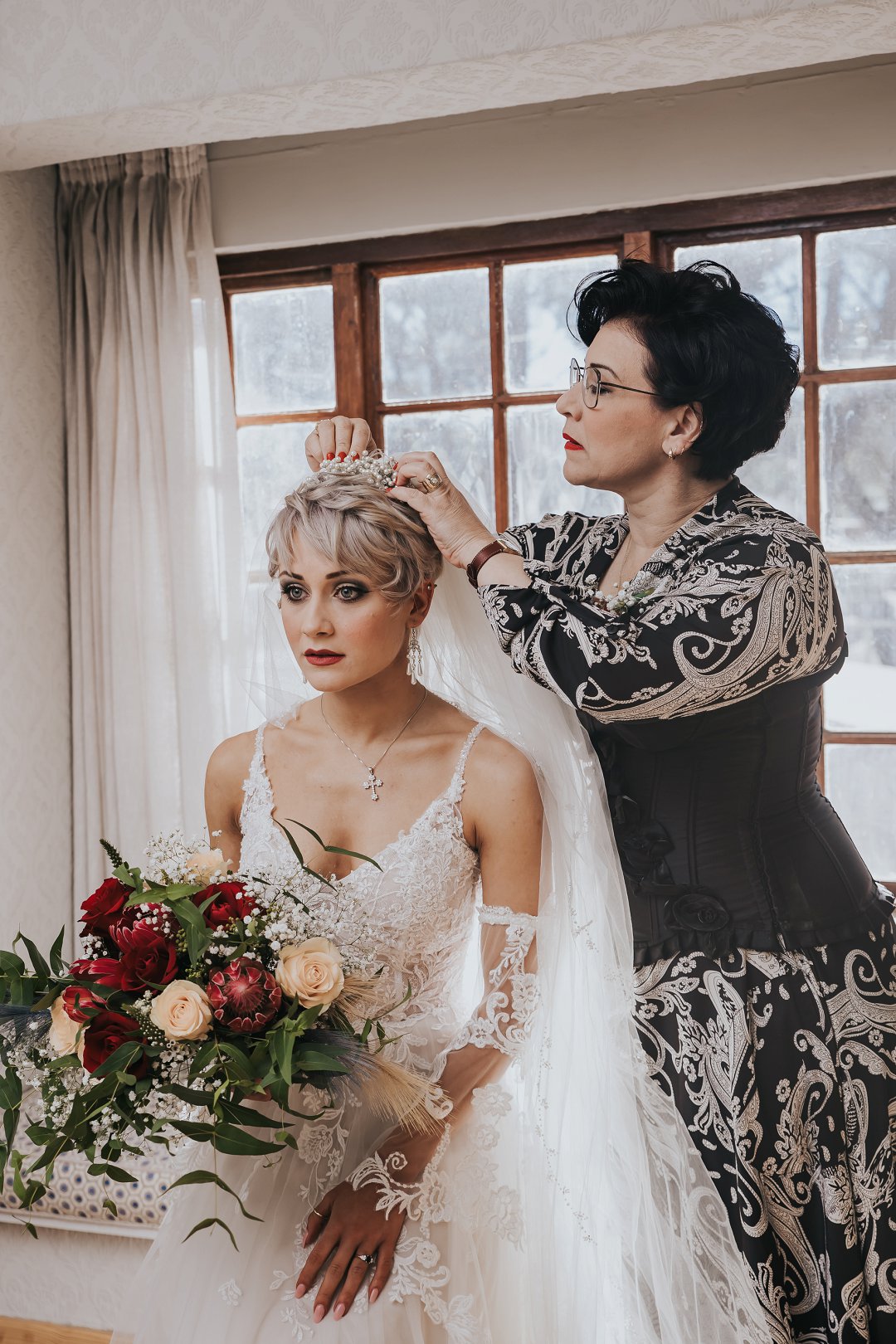 Daar was eers ‘n paar weergawes van die ‘droom trourok’ voordat die bruid op die snit by Bridal Emporium afgekom het. Ingevoer van Australië, met ‘n heuning-kleurige ondertoon, het die fyn gedetailleerde A-lyn sleë haar hart gesteel. Die sluier is sentimenteel en geleen van haar tannie af by wie se troue sy ‘n blomme meisie was. Afgerond met die ‘ietsie-blou’ was haar verloofring en haar vier strooi meisies wat gespog het in blou fluweel. Die bruidegom het ‘n tradisionele aandpak gedra met satyn detail. Die das was sy keuse van blou ‘paisley’ en sy hare in lang krullerige lokke gedra.