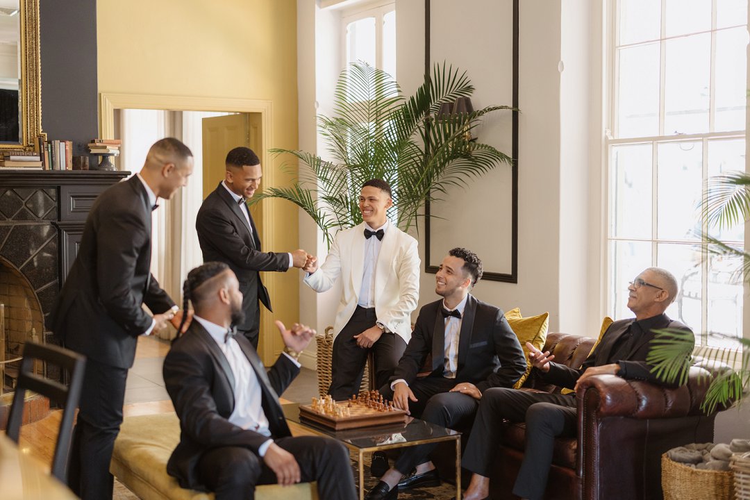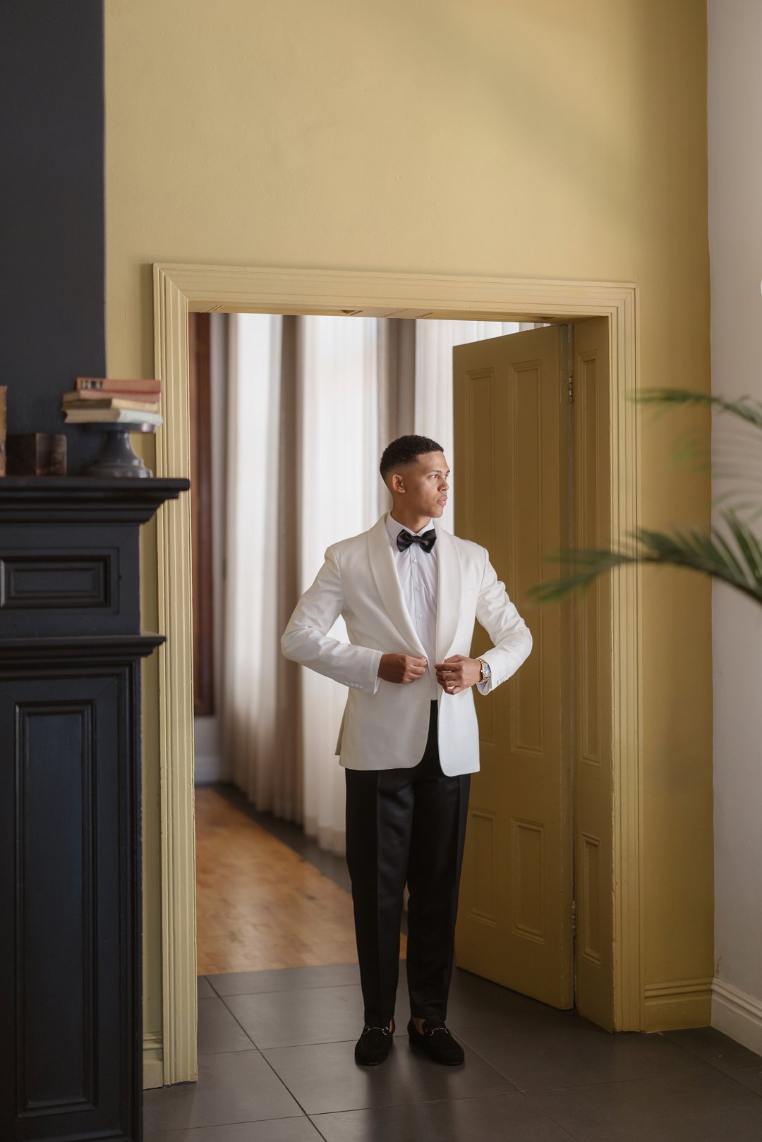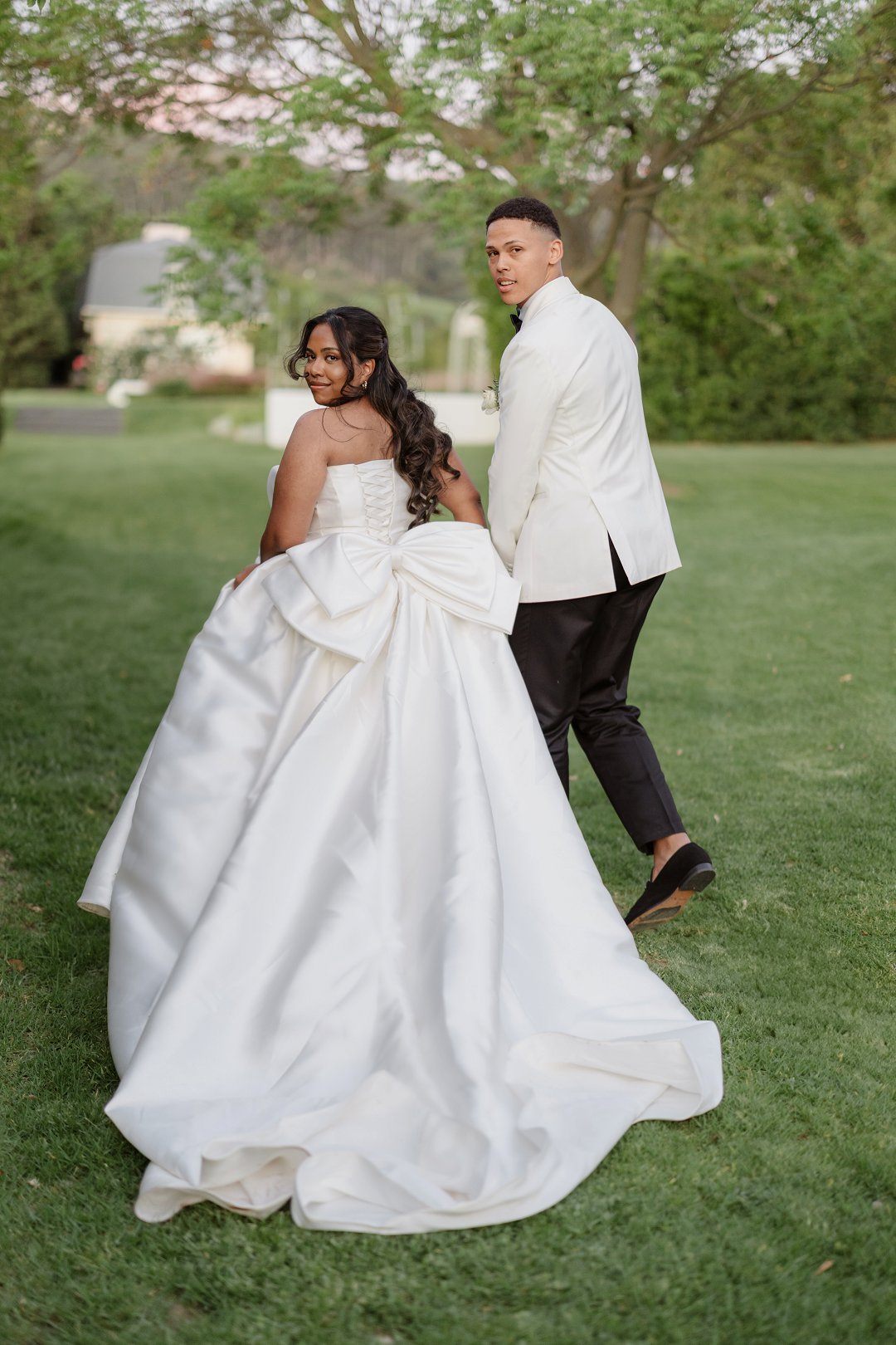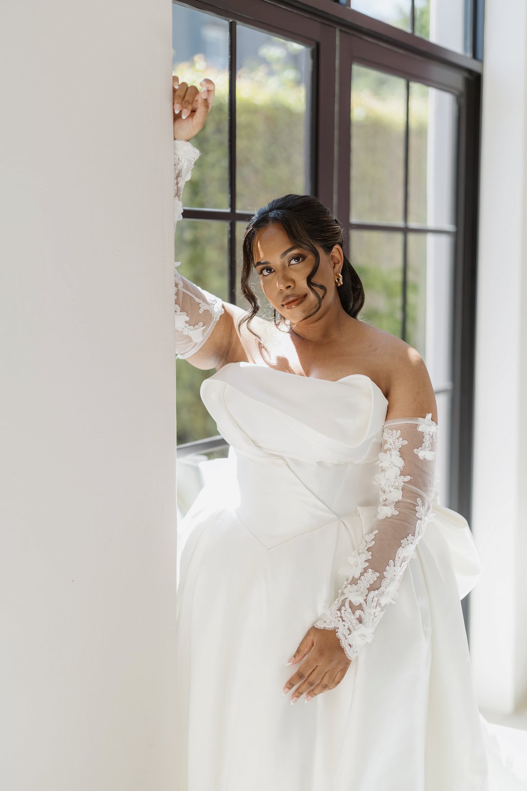 My Mikado basque waist gown was inspired by calla lilies, with petal-like folds, detachable sleeves and a dramatic bow. Later, I changed into a lace mini dress ready to dance the night away. Jesse looked every bit the classic groom in a cream tuxedo jacket with black trousers and suede Horsebit loafers.