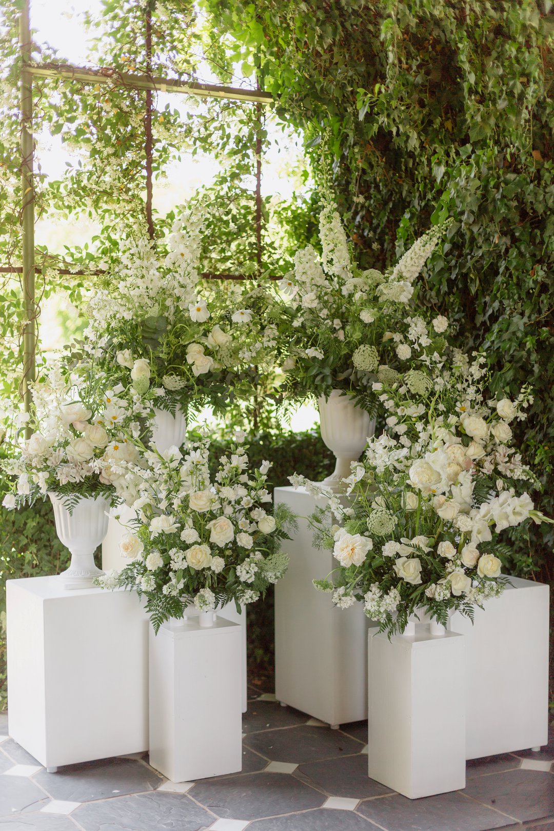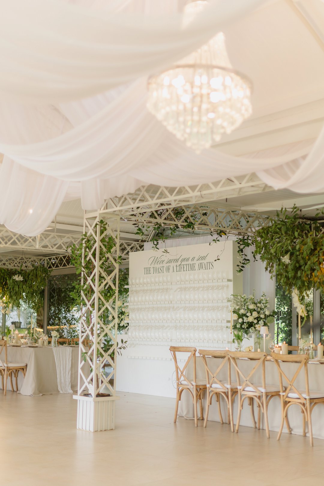 Our palette of creams, beige and green created an atmosphere that was dreamy and effortless. Layered textures of linen, travertine stone, chiffon and soft draping added warmth and depth, while the lush greenhouse chapel, overflowing with foliage and floral plinths, made our ceremony feel intimate and alive. We encouraged our guests to embrace “La Dolce Vita” in their attire, and they became the most beautiful pops of colour against our soft, neutral setting.