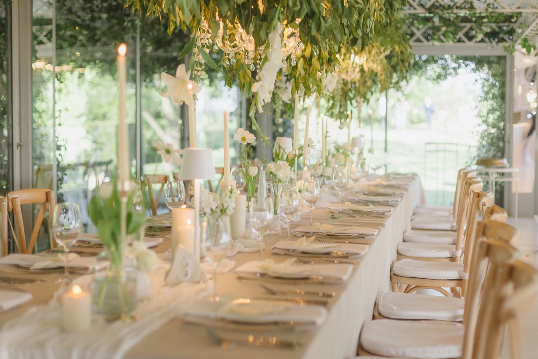 Our reception felt like a dream dinner under the Italian sun, with overhanging gardens suspended from the ceiling, shimmering chandeliers, golden candlelight, Costa Nova dinnerware and custom stationery tying every detail together.