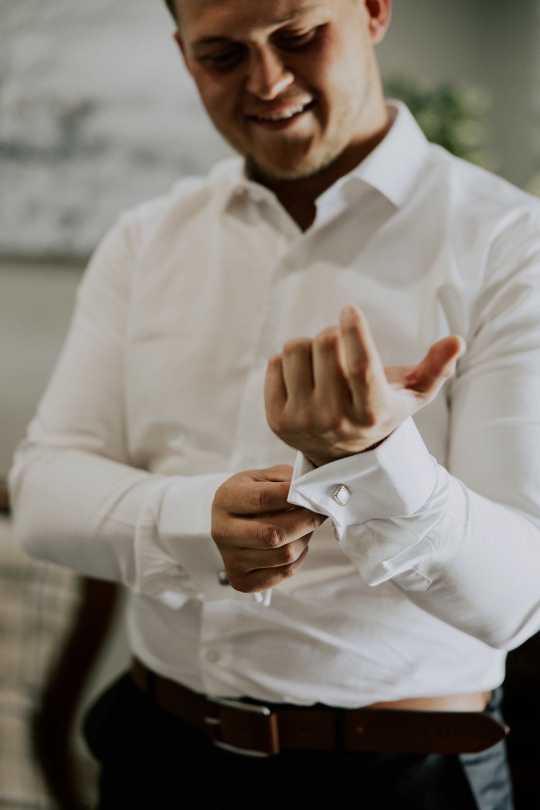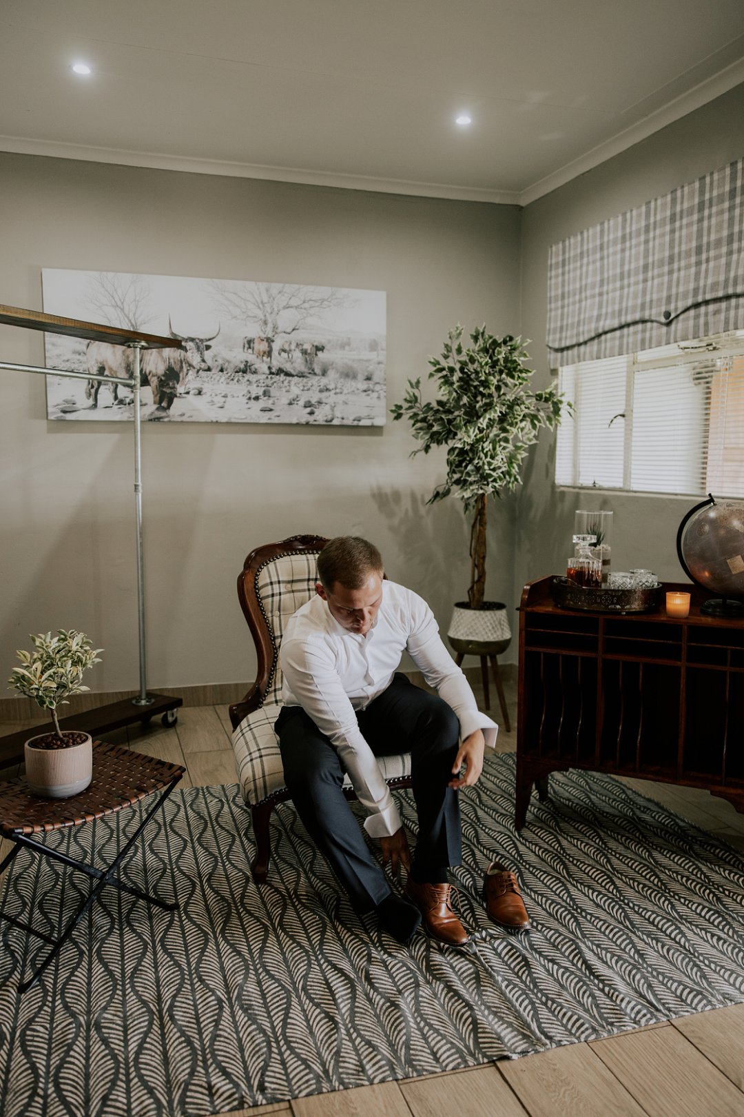 JJ se troupak was perfek in elke sin — stylvol, gemaklik en tydloos. Wat dit egter regtig sy eie gemaak het, was die leer strikdas wat gemaak is deur Skoonsus. Die horlosie op sy arm was ‘n geskenk van my om te beklemtoon dat dit ons tyd is en ek my tyd vir hom gee. Die “cufflinks” was my skoonpa s’n wat hy vir hom geleen het.