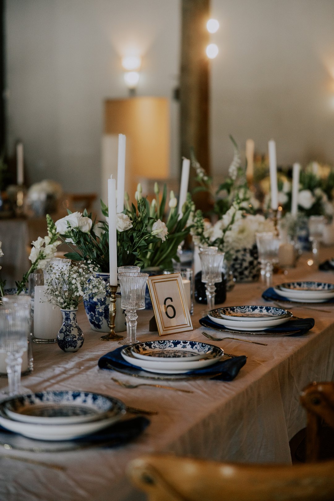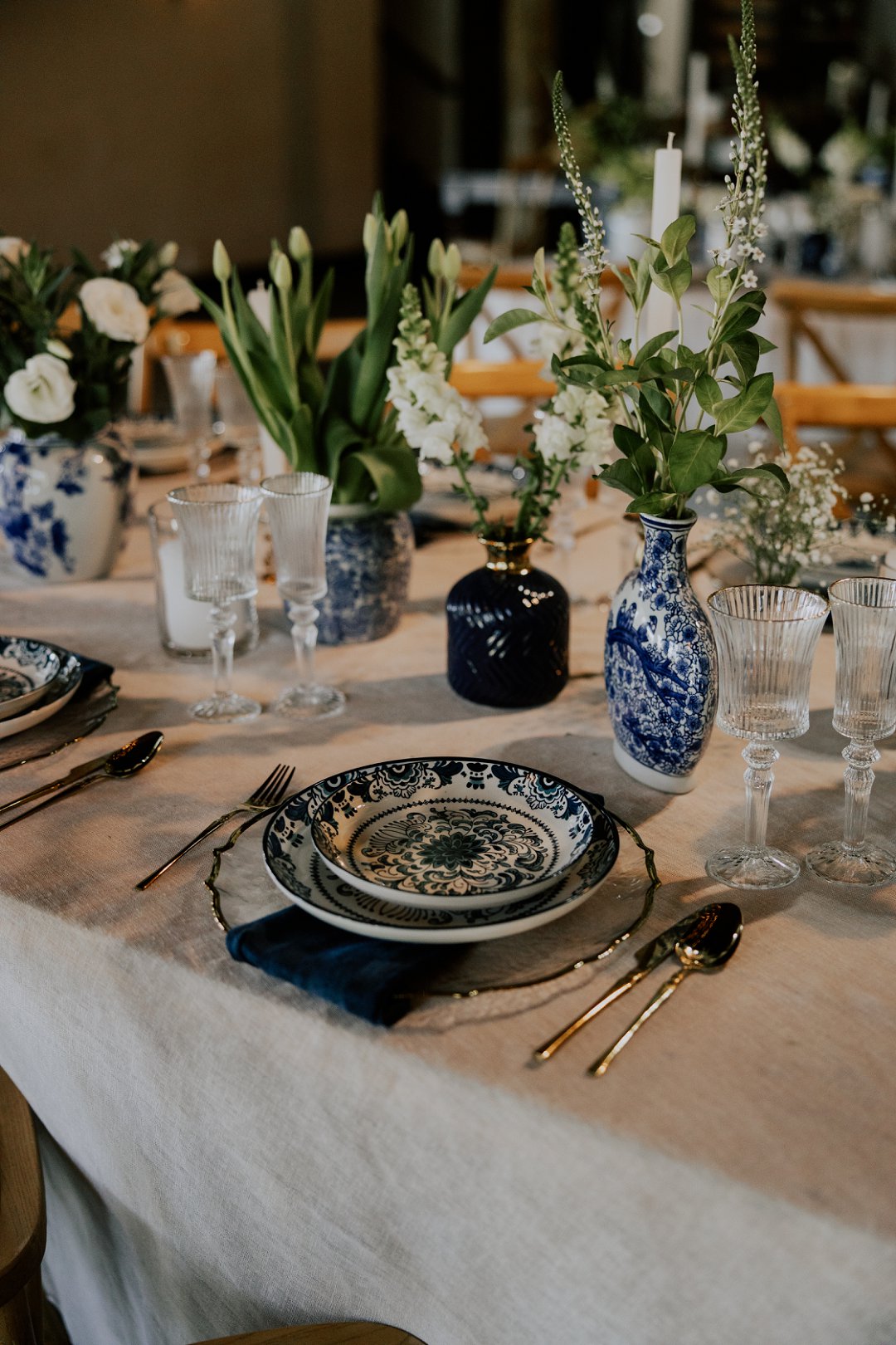 Die tafels was ’n kunswerk van eenvoud en verfyndheid — die gevoel van kalmte, styl en tydlose skoonheid te skep. ’n Sagte linne tafeldoek het die grondslag gevorm. Die pragtige blou-en-wit porseleinvate, elkeen uniek in patroon en vorm. Elke vaas het vars wit blomme gedra: tulpe, lisianthus en lelies. Die borde, met hul fyn donkerblou patrone, was perfek in harmonie met die vate. Elke plek was sorgvuldig gedek met goue eetgerei, wat ’n warm kontras teen die koel blou en wit geskep het. Donkerblou servette was netjies onder die borde ingevou.