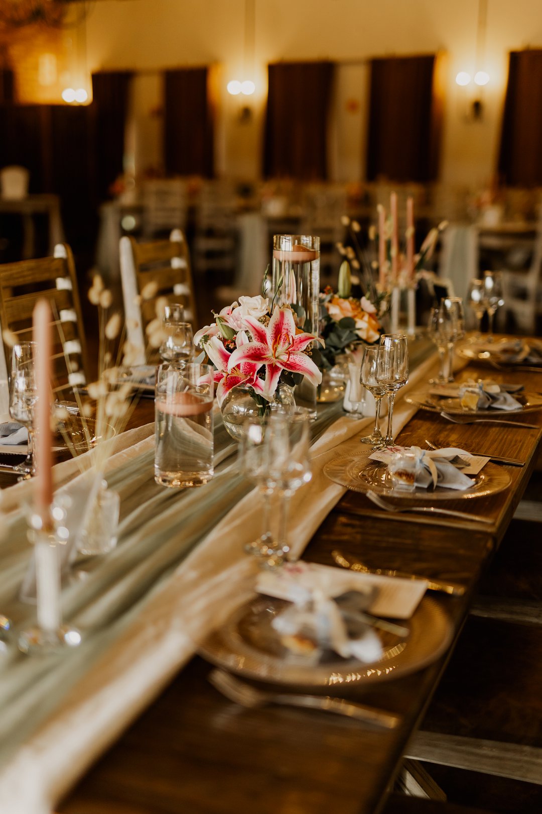 Ons kleurskema het bestaan uit grysblou en dusty pink, aangevul deur sage green, sagte champagne-aksente en warm bruin ondertone. Die dekor en blomme is noukeurig gekies om hierdie palet te weerspieël. Tiger lilies, gemeng met rose, wasblomme en verskillende lelies, het ’n romantiese, vars en natuurlike gevoel aan die dag gegee.