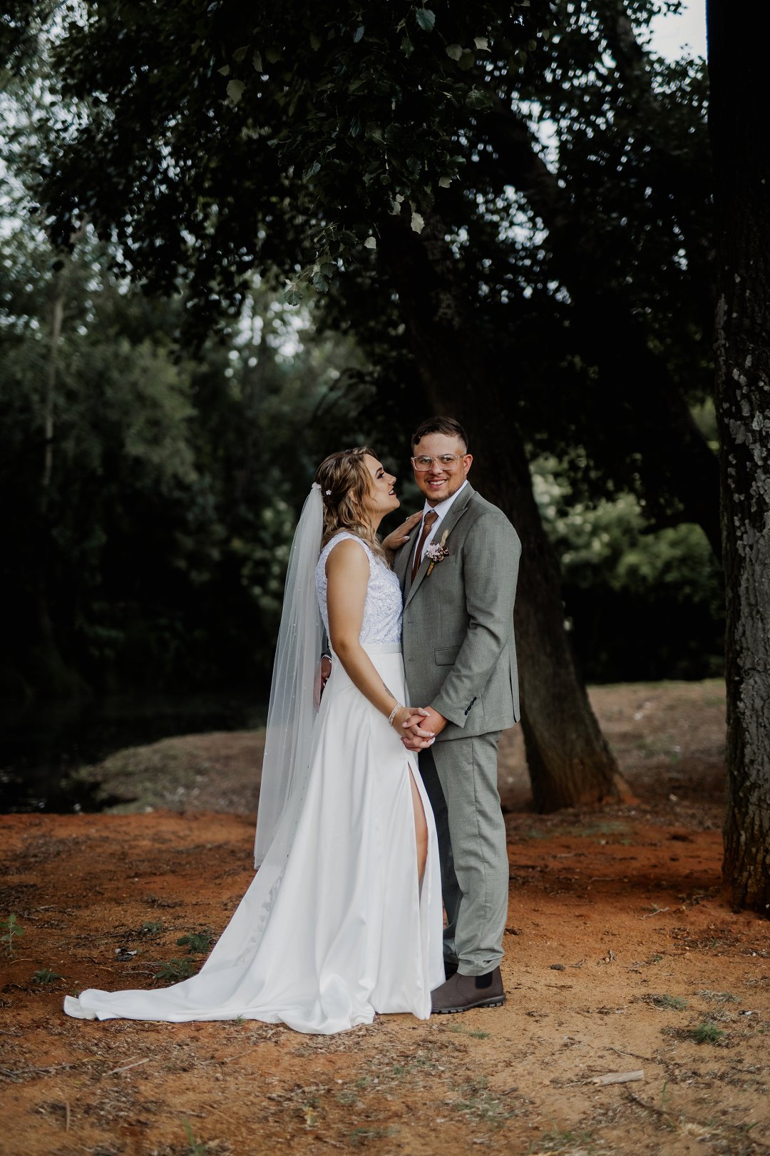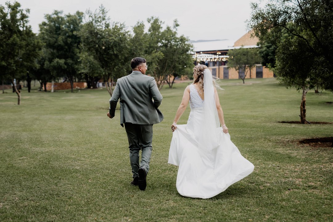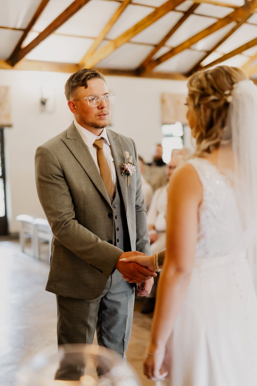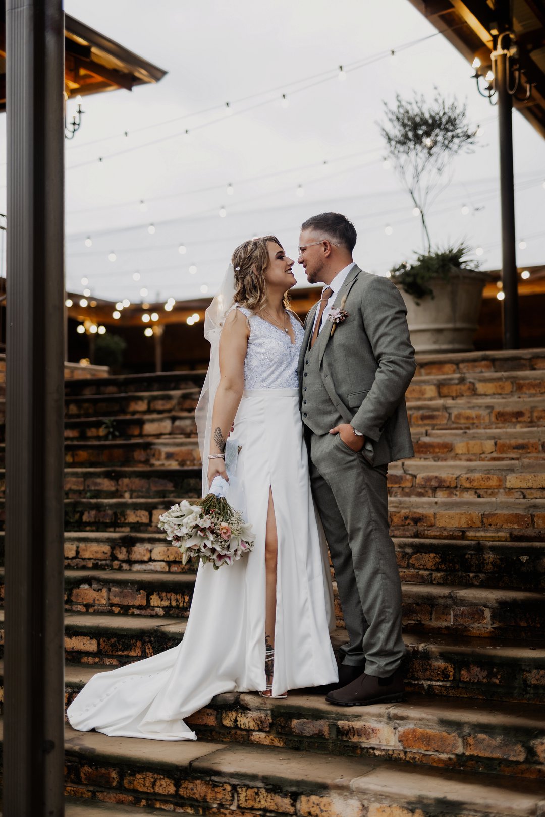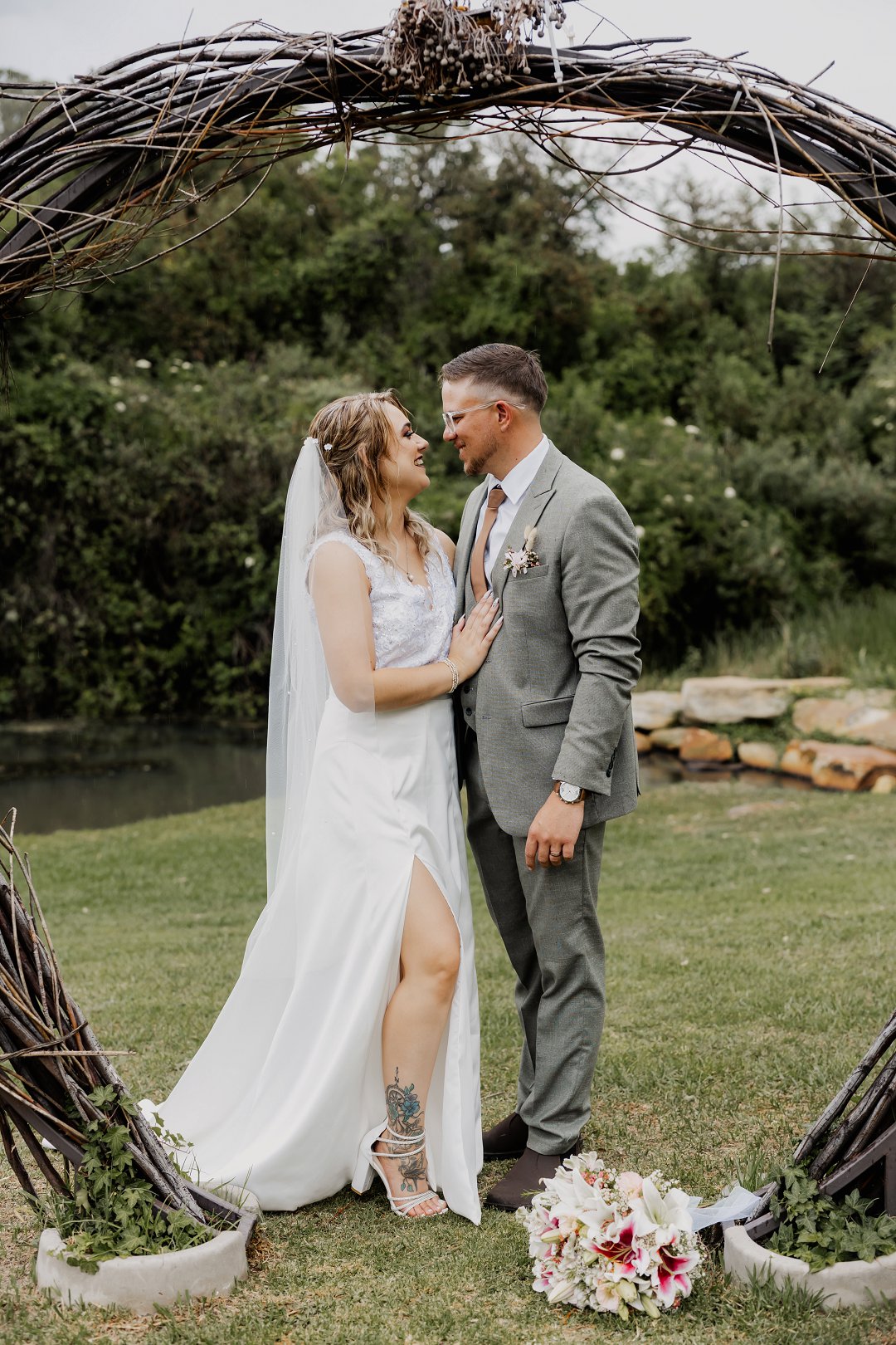 Die bruid se trourok was off-white, elegant en verfyn, met sagte kantdetail en delikate pêrels op die trou sluier wat haar natuurlike skoonheid beklemtoon het. Die bruidegom se pak was grysgroen, gekombineer met ’n wit hemp en bruin skoene, wat ’n moderne maar klassieke voorkoms geskep het.
