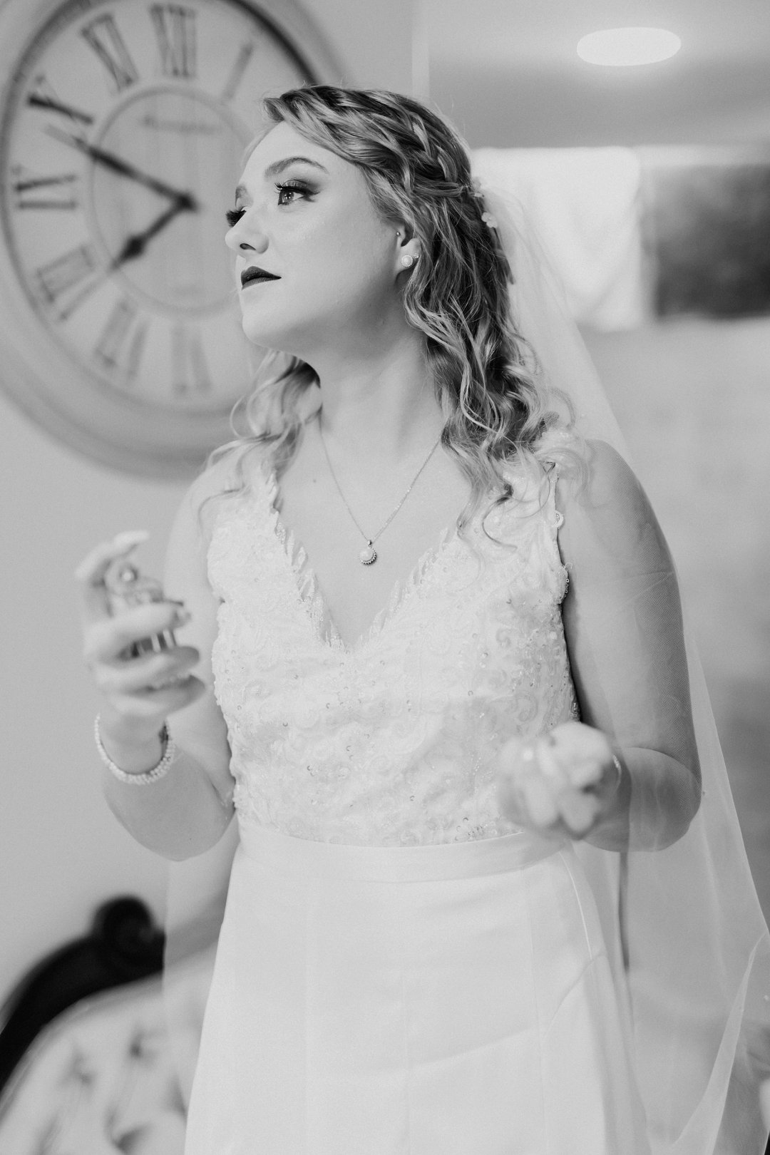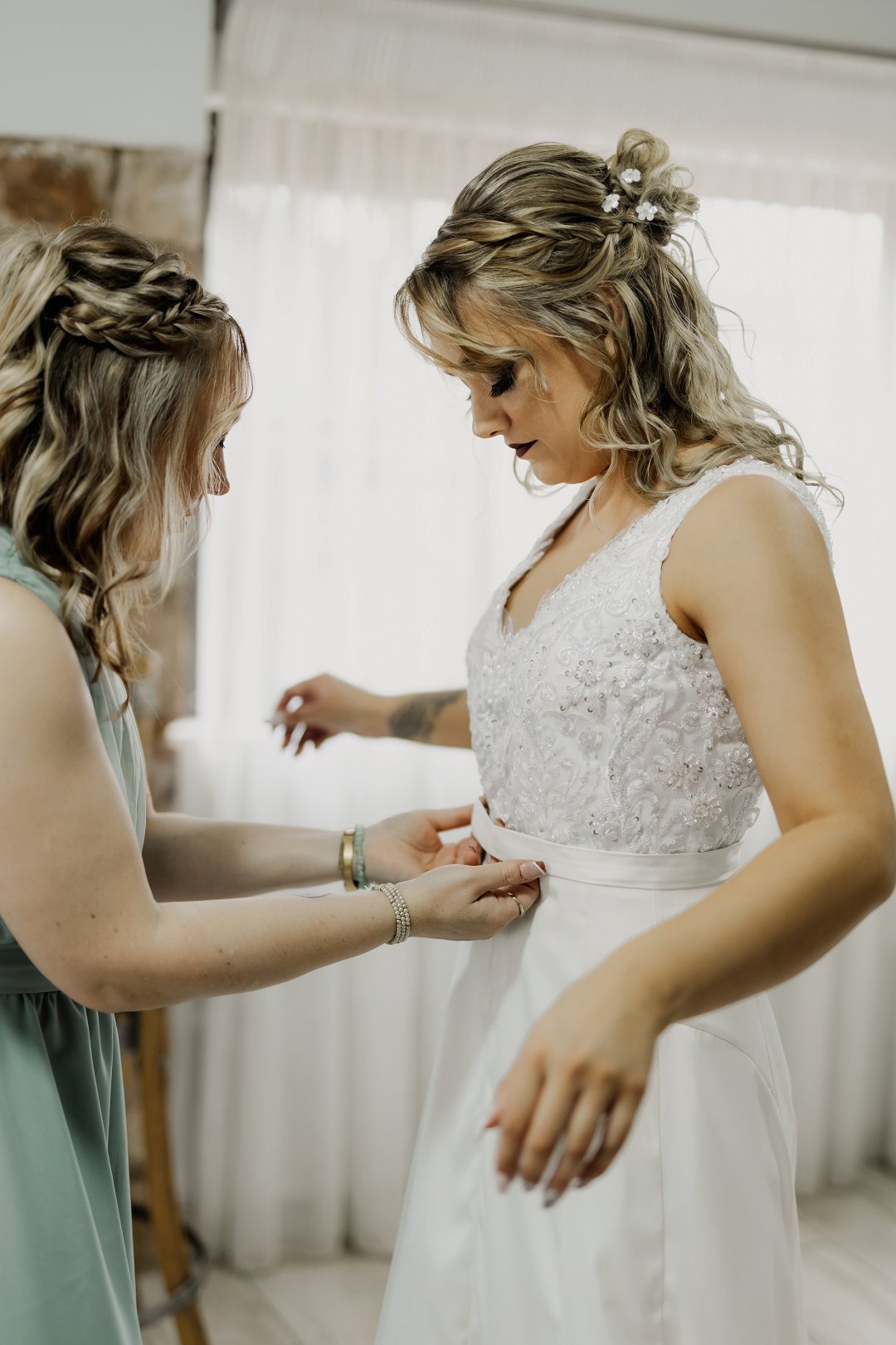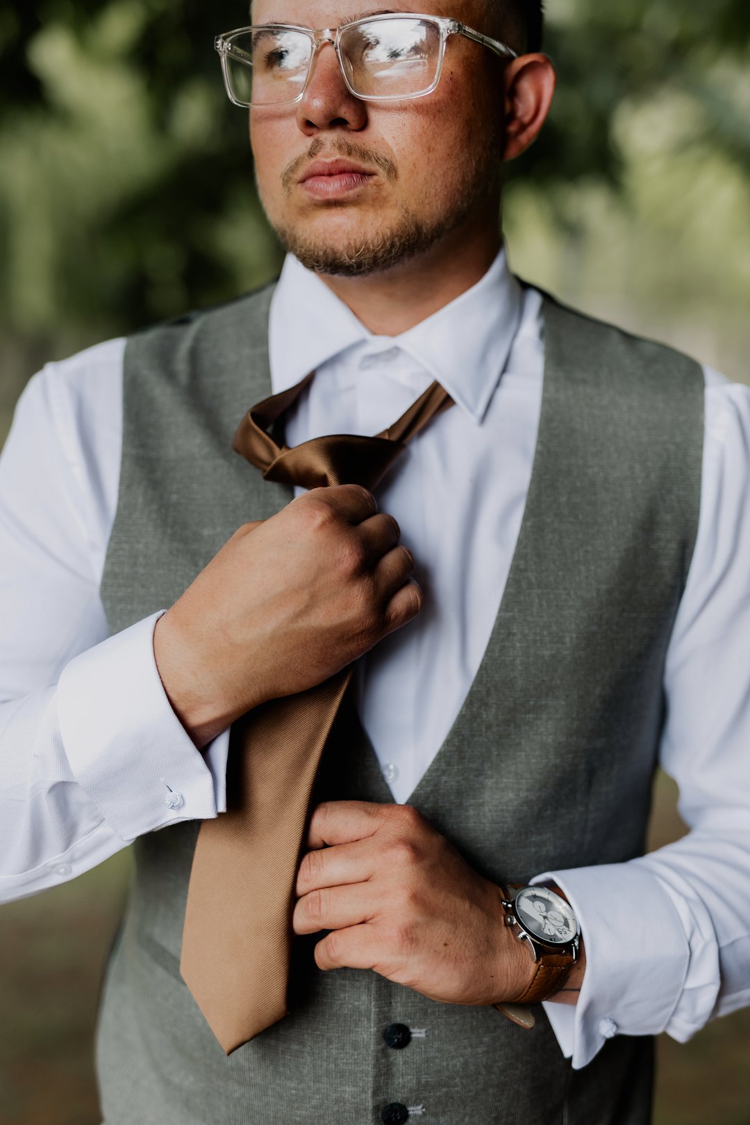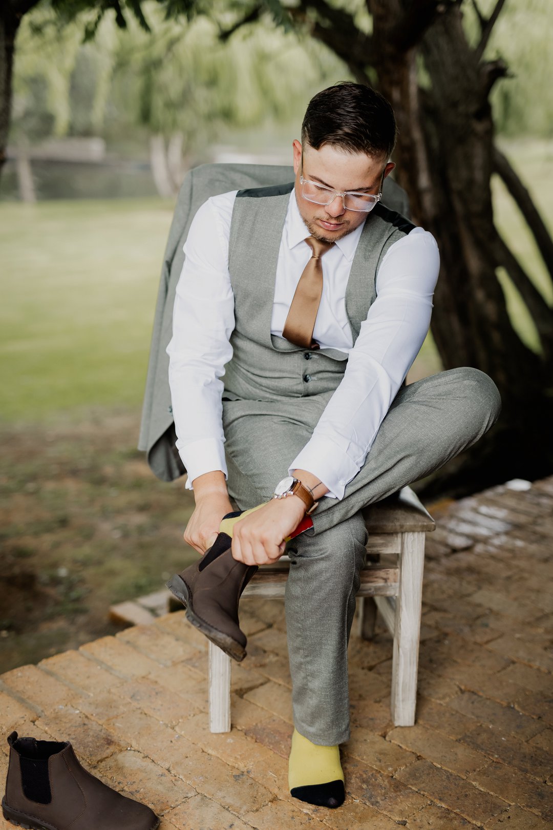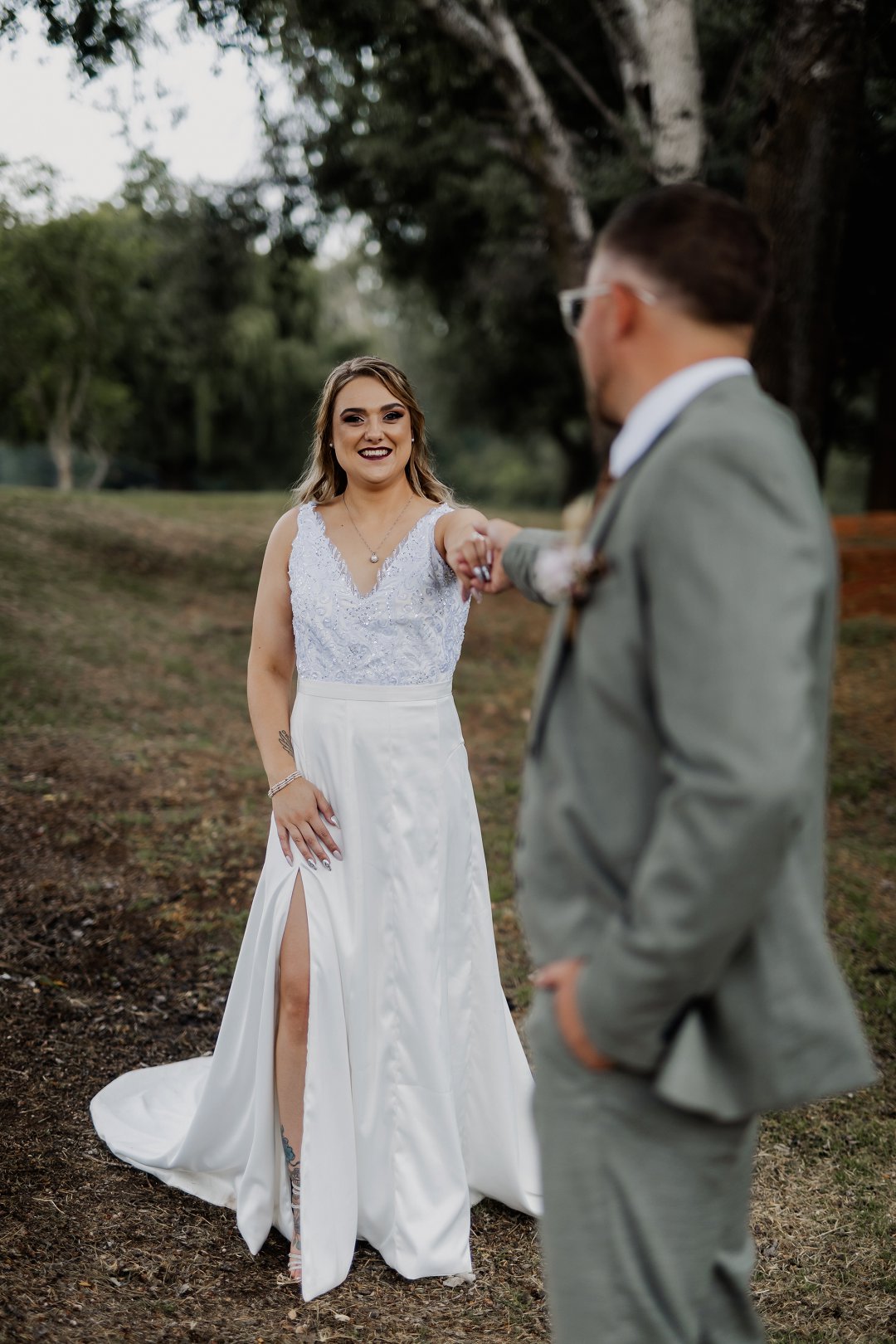 Die bruid se trourok was off-white, elegant en verfyn, met sagte kantdetail en delikate pêrels op die trou sluier wat haar natuurlike skoonheid beklemtoon het. Die bruidegom se pak was grysgroen, gekombineer met ’n wit hemp en bruin skoene, wat ’n moderne maar klassieke voorkoms geskep het.