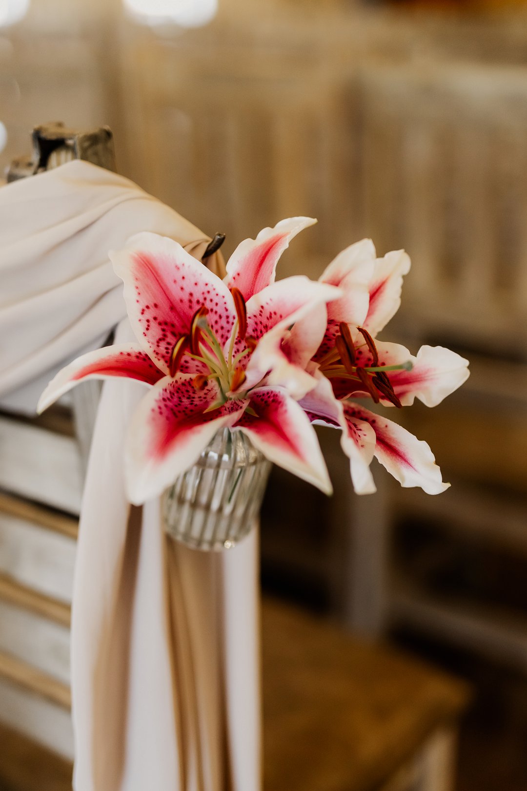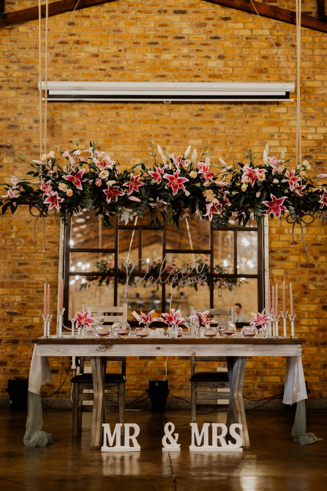 Ons kleurskema het bestaan uit grysblou en dusty pink, aangevul deur sage green, sagte champagne-aksente en warm bruin ondertone. Die dekor en blomme is noukeurig gekies om hierdie palet te weerspieël. Tiger lilies, gemeng met rose, wasblomme en verskillende lelies, het ’n romantiese, vars en natuurlike gevoel aan die dag gegee.