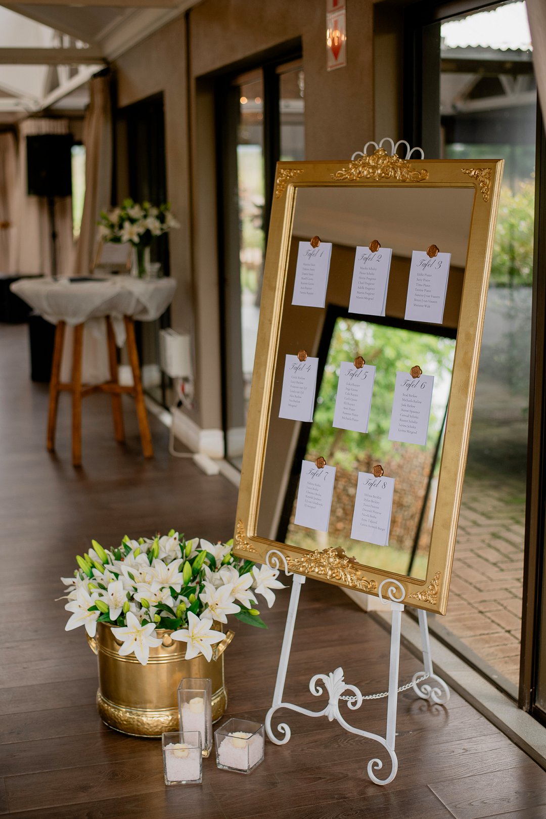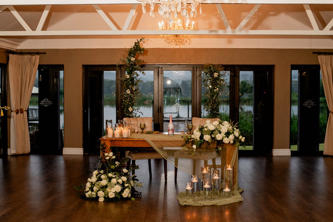 Die dekor, bruidstafel en kerkuitleg is met ongelooflike sorg deur Executive Weddings Parys gedoen – hulle het ons visie in ’n werklikheid omskep. My handruiker was ’n pragtige skepping van The Flowershed, terwyl ek self die bridesmaids se ruikers en die gaste-tafelblomme gemaak het – ’n klein maar baie spesiale persoonlike aanraking.